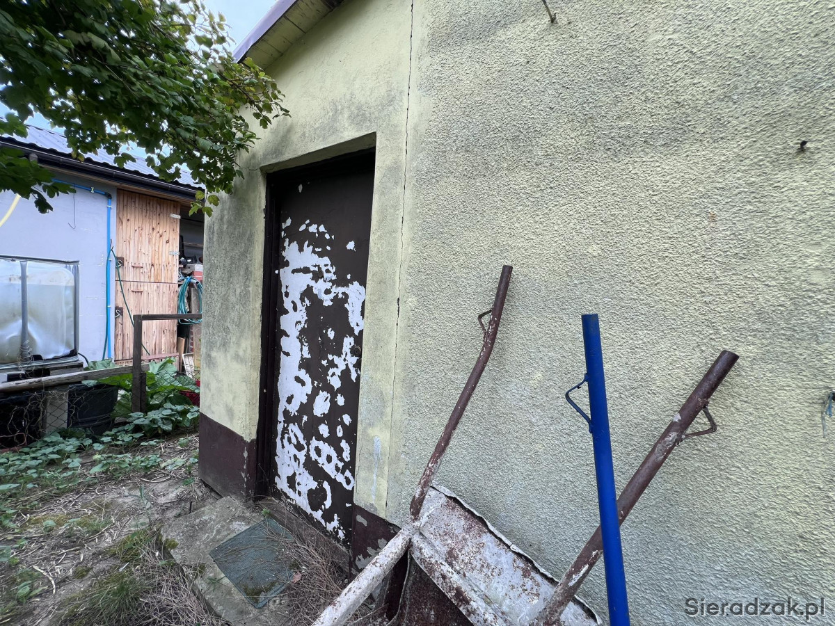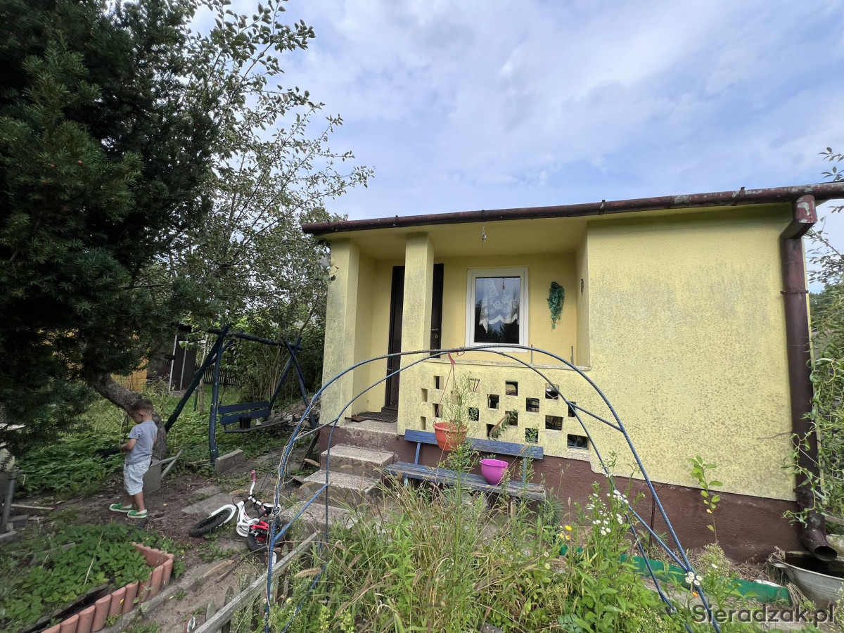 Działka ma powierzchnię ok. 220 m2 (11,5m x 19,5m). Znajduje się tam murowany domek z wydzieloną częścią gospodarczą (bok budynku obok huśtawki). Posiada on dostęp do prądu. Na działce znajduje się pompa wody.