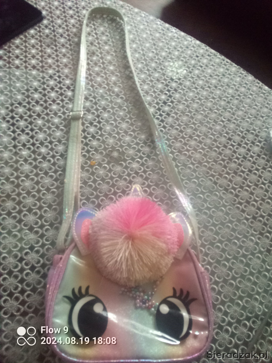 Sprzedam jak nowa torebkę dla dziewczynki Jednorożec regulowany paseczek zapinana na zamek. Jednokomorowa. Piękne kolory. Pomponik ruchome kuleczki. Zapraszam.