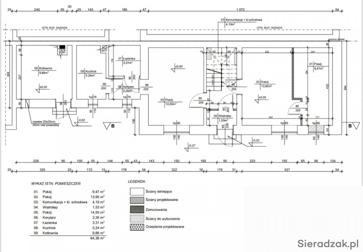 Dom piętrowy o powierzchni użytkowej około 120m2., nadający się do zamieszkania, posiada ogrzewanie podłogowe w całej części mieszkalnej zasilane pompą ciepła, na dachu zamontowana fotowoltaika o mocy 4,96kWp. Dach dwuspadowy pokryty blachodachówką Budynek jedną ścianą przylega do zabudowań sąsiadującej działki.