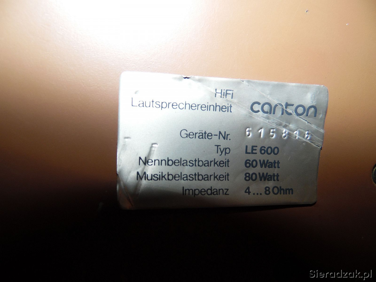 Canton model LE600, trójdrożne obudowy typu zamknięte. Głośnik nisko tonowy o średnicy 25cm na gumowym zawieszeniu, głośnik średnio tonowy i wysoko tonowy to kopułki tekstylne o średnicy 3,8cm i 1,9cm. Jest to pierwsza edycja produkowana w latach 1973-75. Jest to charakterystyczne brzmienie lat 70, miękki dobrze zróżnicowany nisko schodzący bass, doskonała średnica, dobrze eksponujące wokale oraz krystaliczna góra. Jest to pierwsza seria.