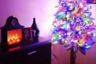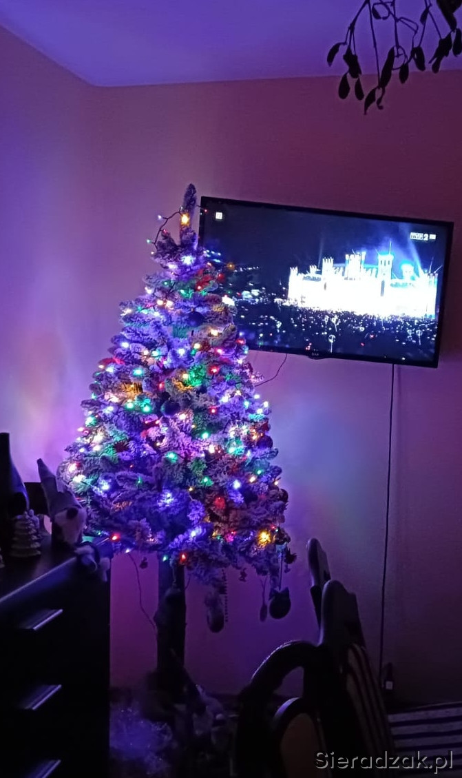 Sztuczna choinka - biała "ośnieżona", na masywnym pniu. Wysokość ok. 2,05 m. Kompletna, z podstawą i workiem jutowym. Na zdjęciach oświetlona lampami LED, dlatego kolorowa.