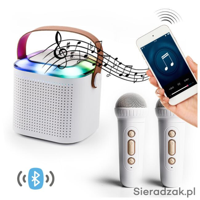 Bezprzewodowy zestaw karaoke z dwoma mikrofonami, przenośnym głośnikiem, obsługą Bluetooth, portem TF (karta microSD) i wyjściem AUX, który doskonale sprawdza się podczas dziecięcych zabaw, wakacyjnych wyjazdów, ognisk, domówek, prywatek i imprez z przyjaciółmi. Dzięki wbudowanym efektom i prostej obsłudze, sprzęt gwarantuje wszystkim świetną zabawę. Przez to, że w zestawie zawarte są dwa mikrofony, impreza karaoke jest możliwa nie tylko w trybie solo, ale także we dwójkę, co gwarantuje jeszcze lepszą zabawę. Dodatkowym atutem tego zestawu karaoke jest jego unikalny, elegancki design.