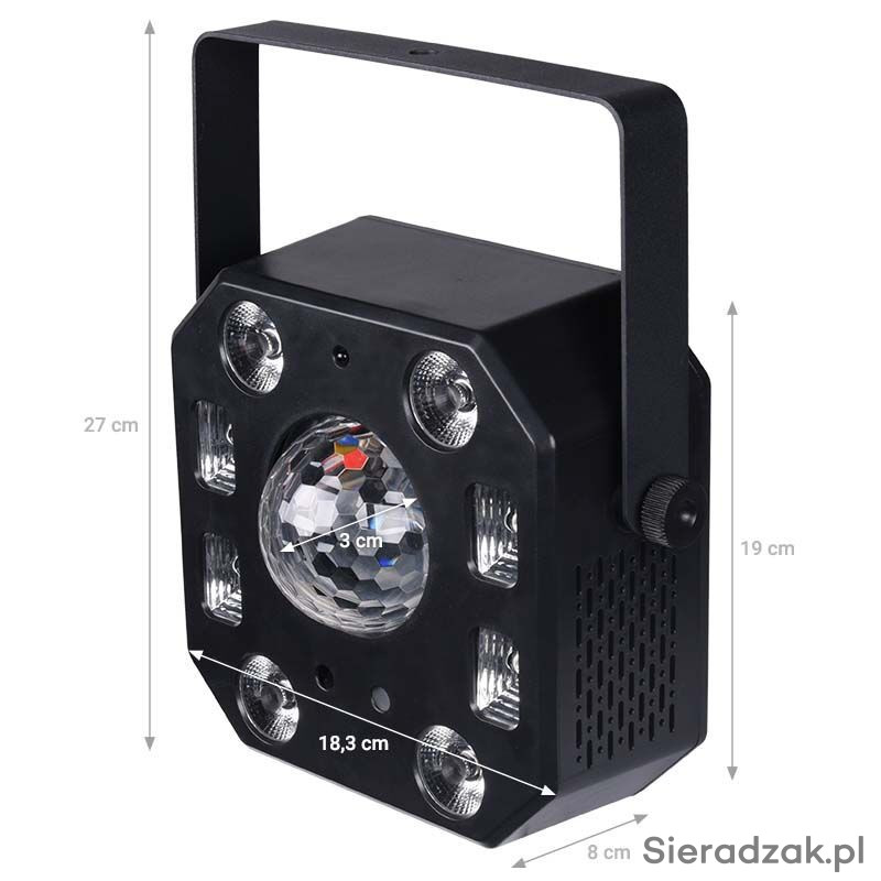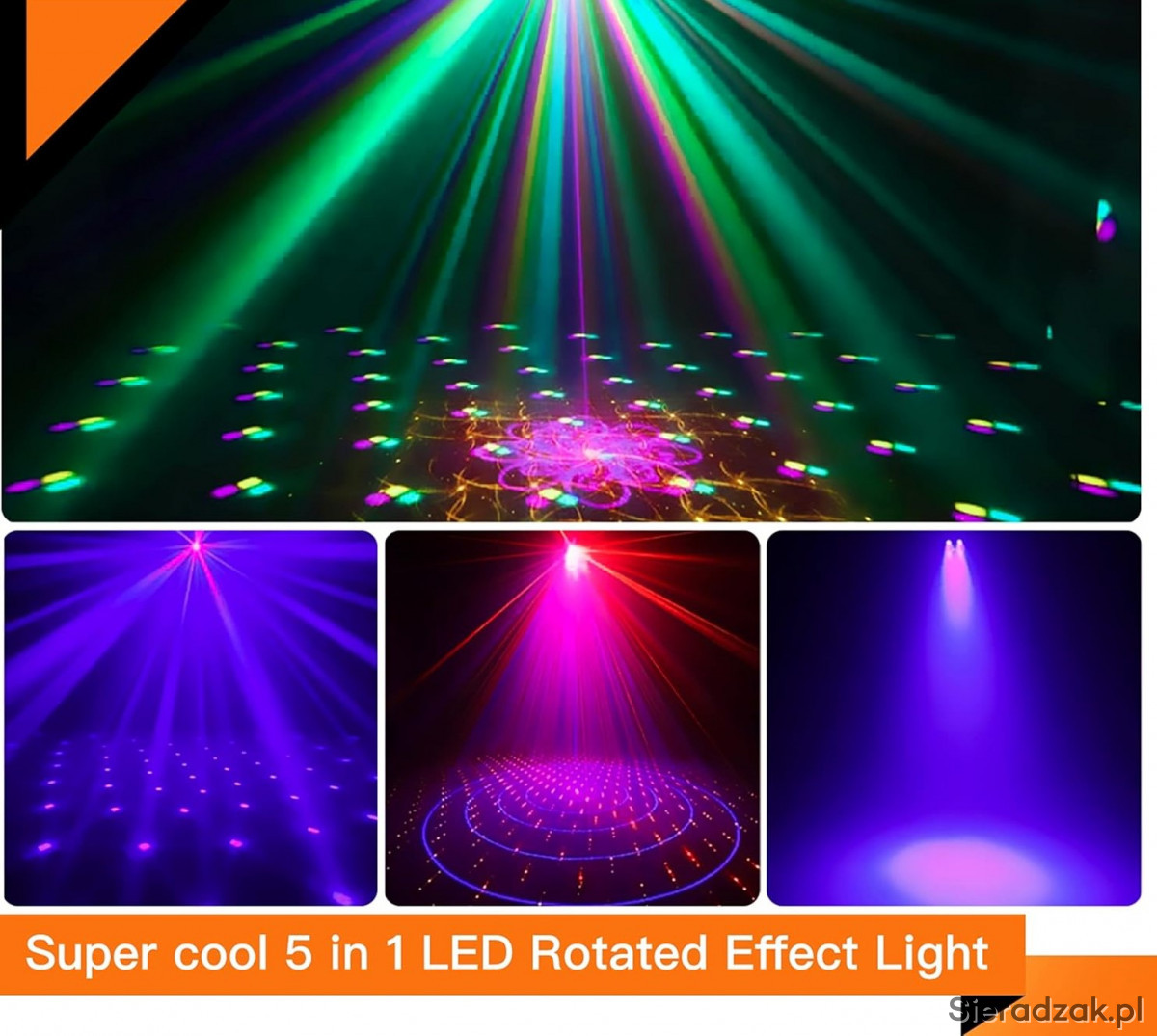 Połączenie 5-efektów w jednej obudowie Led Par + disco kula + lasery + stroboskop + UV ultrafioletet. Dzięki temu posiada duże możliwości pracy w każdych warunkach. Każdy użytkownik będzie z pewnością zadowolony mając możliwość użycia wszystkich efektów na każdej imprezie. Doskonale sprawdza się jako oświetlenie sceniczne w domach i ośrodkach kultury, podczas koncertów, różnego typu występów, gali i prezentacji, a także w klubach tanecznych, dyskotekach oraz jako oświetlenie dla mobilnych DJ-ów, zespołów i firm eventowych itp.