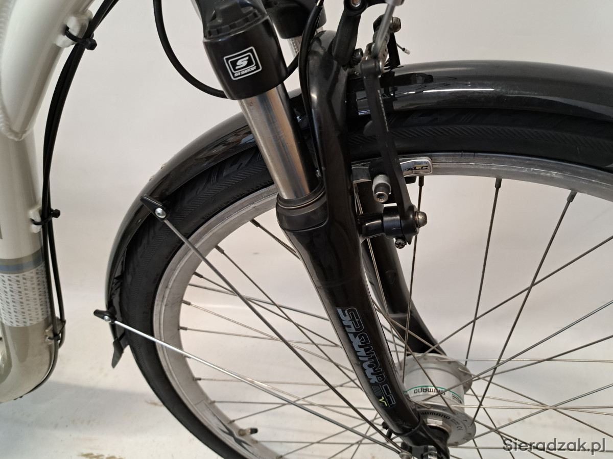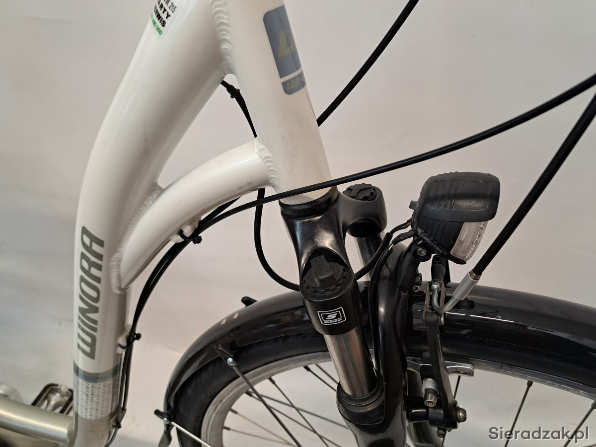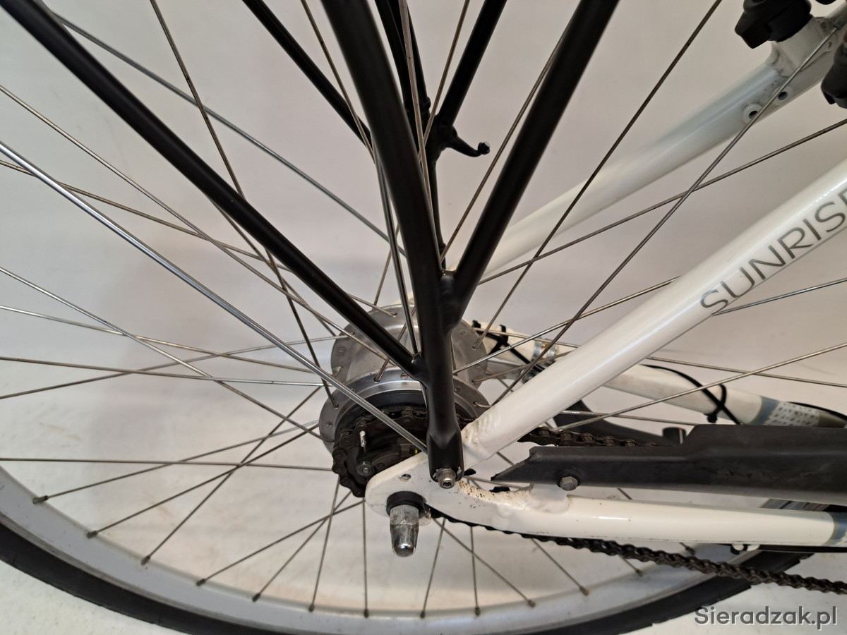 rama aluminium 22" 56cm,przerzutka shimano nexus 8-biegowa w tylnej piaście,amortyzator sr suntour,hamulce v-brake promax,dynamo shimano w przednim kole,oświetlenie lumotec,siodło z amortyzowaną sztycą podsiodłową,wspornik kierownicy regulowany.stan bardzo dobry.