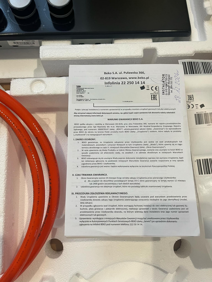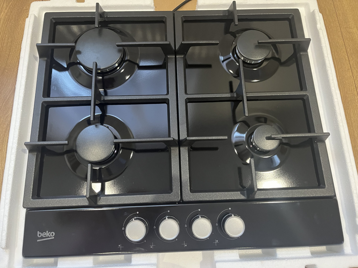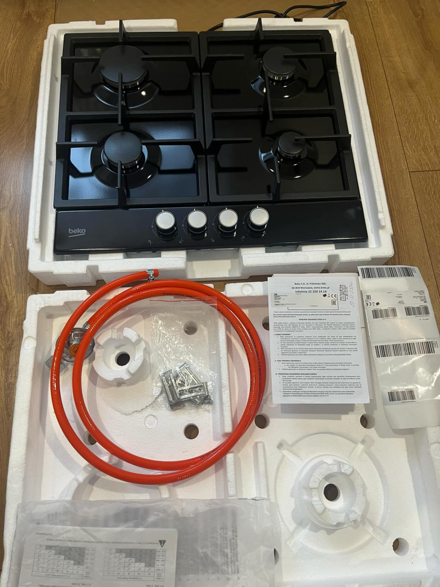 Płyta gazowa Beko do zabudowy. Stan nowy, sprzedaję ze względu na wycięcie zbyt dużego otworu w blacie. Kuchenka przygotowana pod butlę gazową. Podbita przez gazownika.