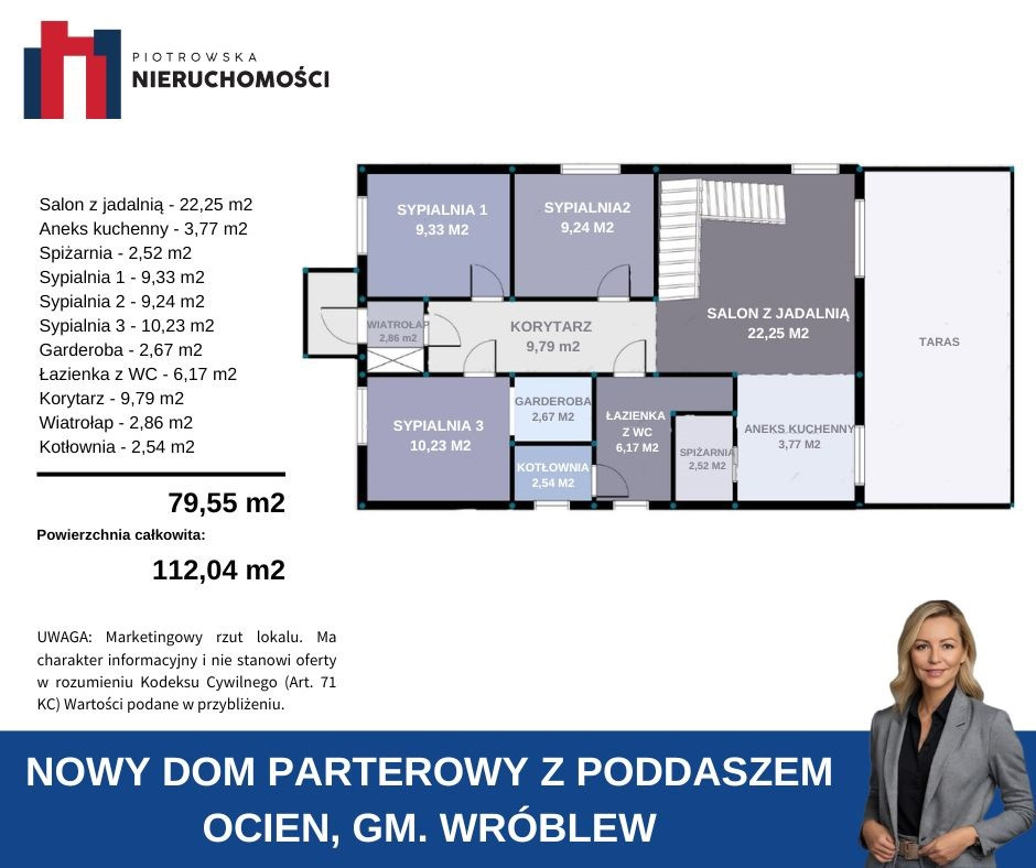 Do sprzedania NOWY, dom jednorodzinny z 2024 r. o pow. użytkowej 79,55 m.kw. położony na dużej, 52,79 arowej działce w miejscowości Ocin gm. Wróblew.