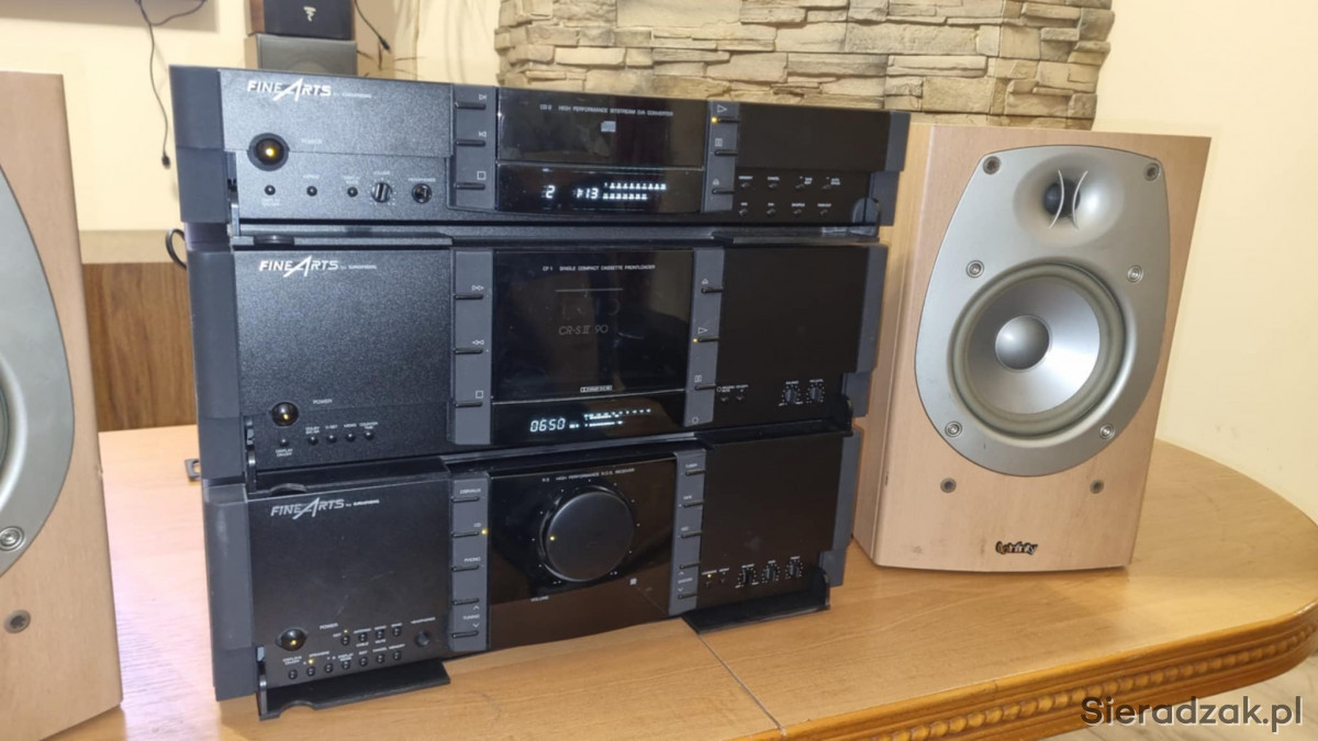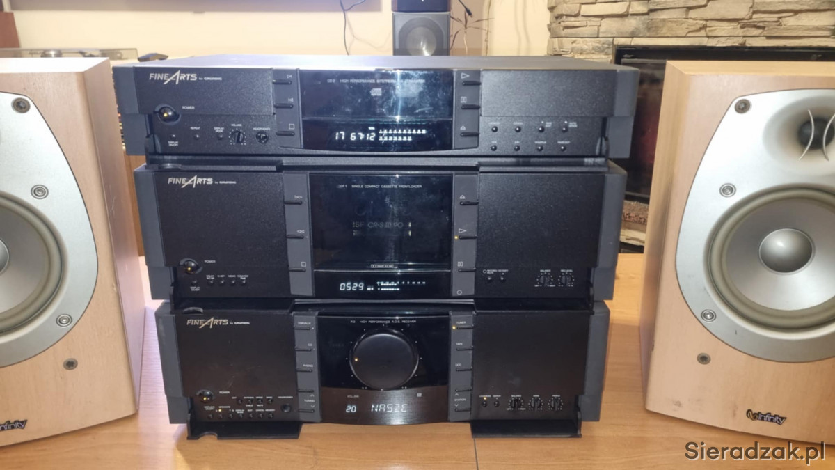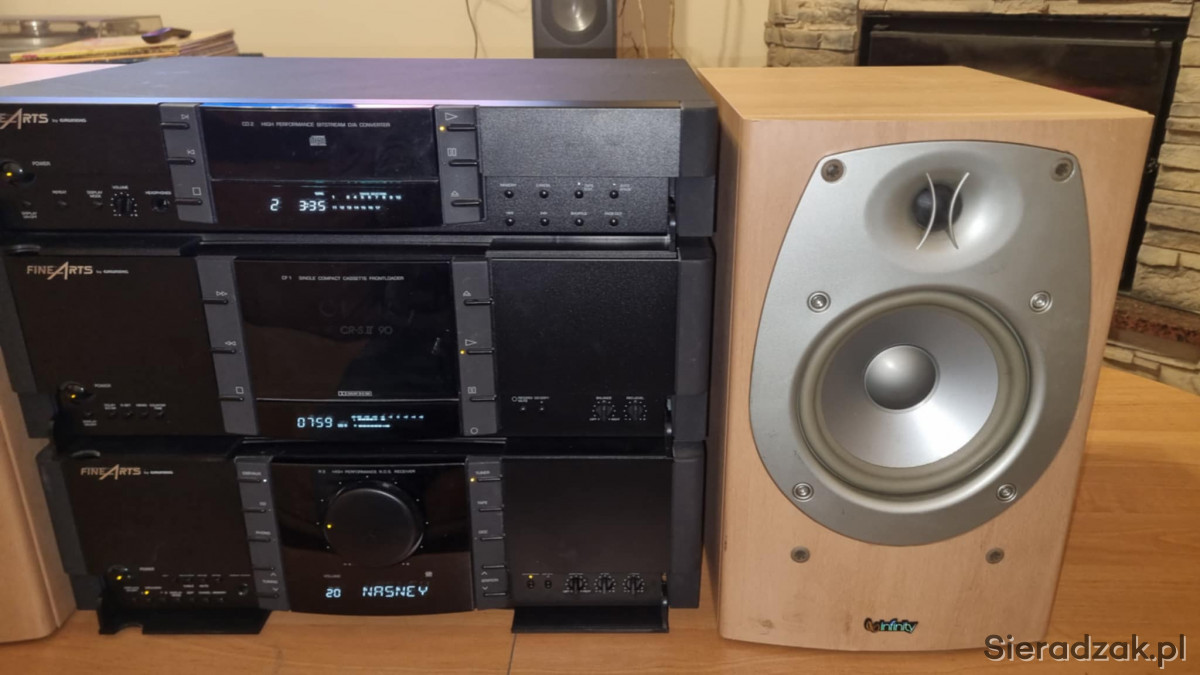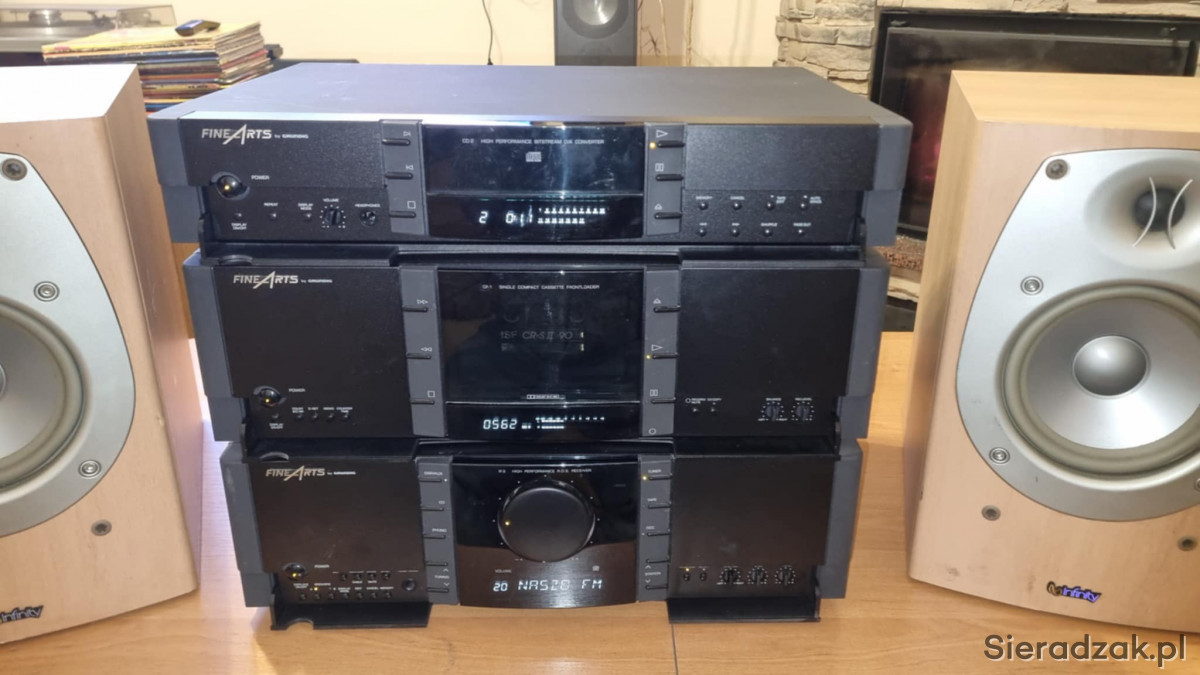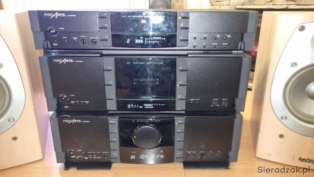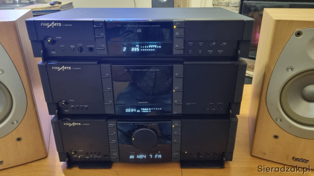 Wieża segmentowa Grundig FineArts amplituner R-3 z RDS Magnetofon kasetowy Grundig FineArts CF-1 oraz odtwarzacz CD Grundig FineArts CD-2. W komplecie kolumny Infinity Beta 20.