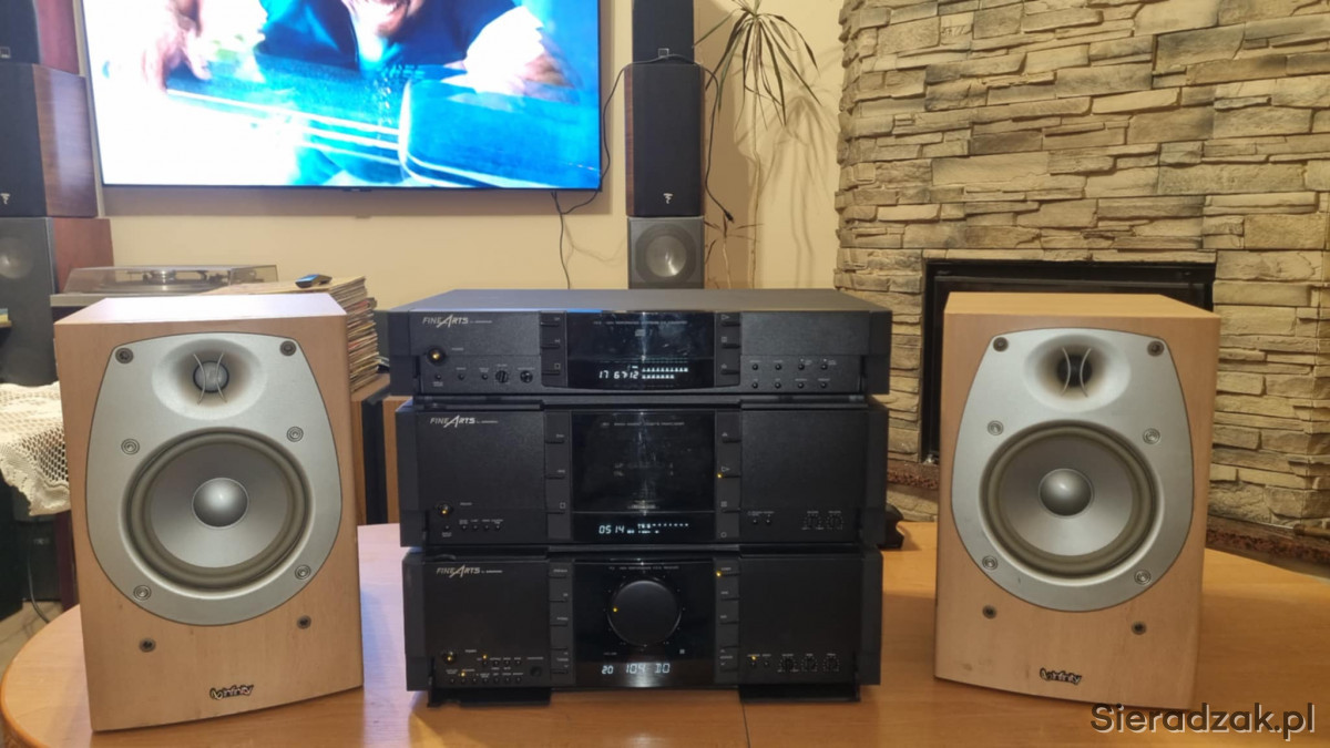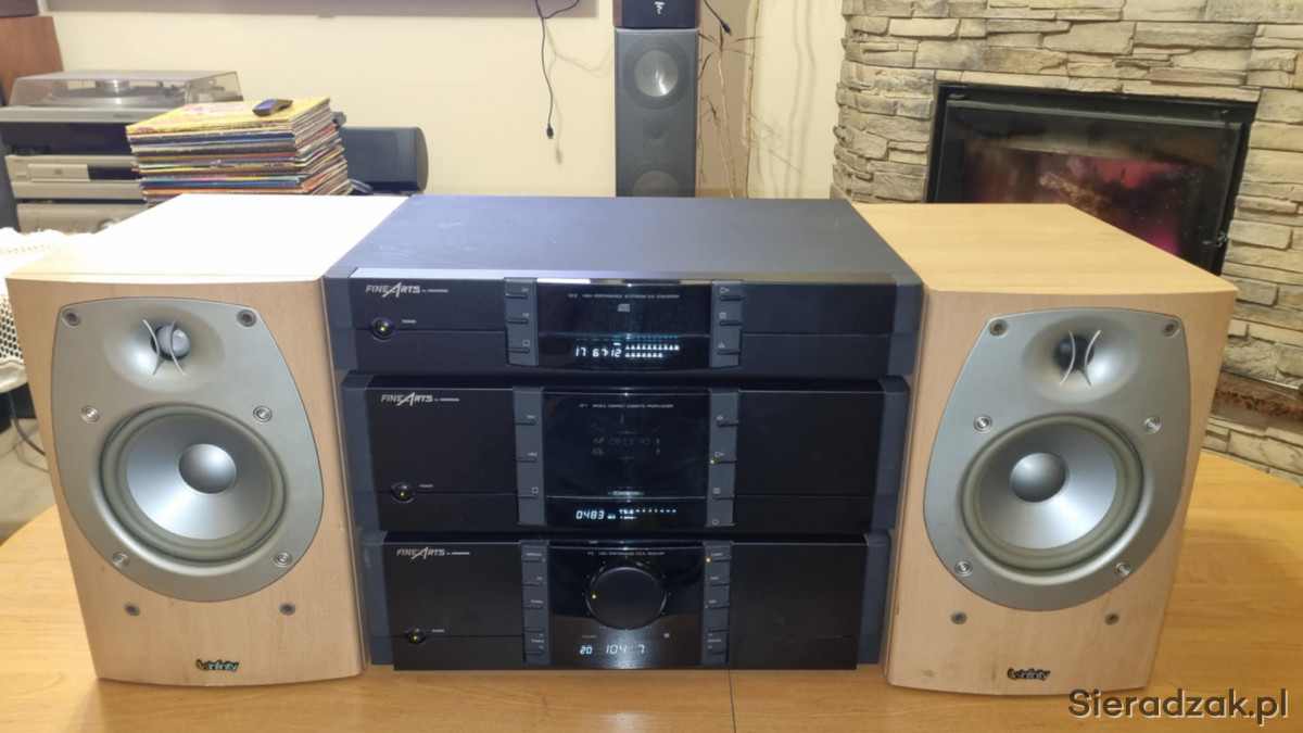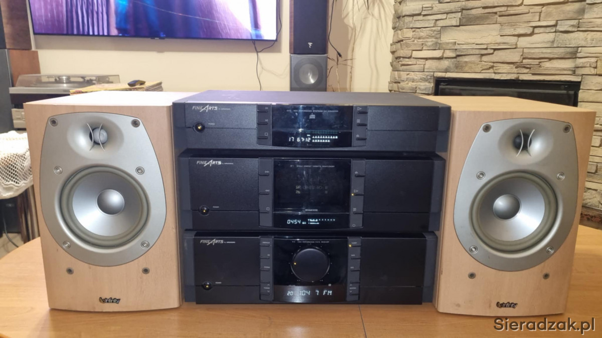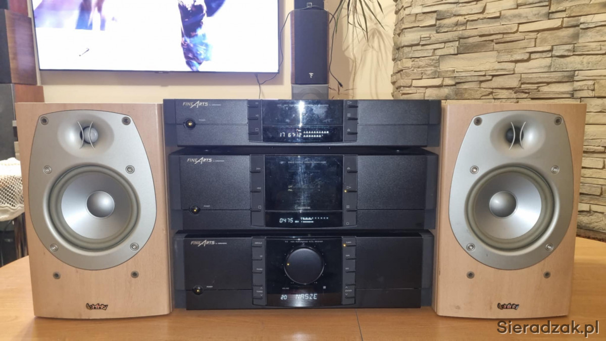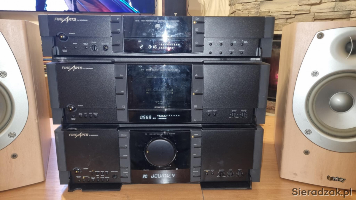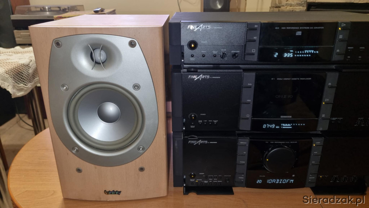Wieża segmentowa Grundig FineArts amplituner R-3 z RDS Magnetofon kasetowy Grundig FineArts CF-1 oraz odtwarzacz CD Grundig FineArts CD-2. W komplecie kolumny Infinity Beta 20.