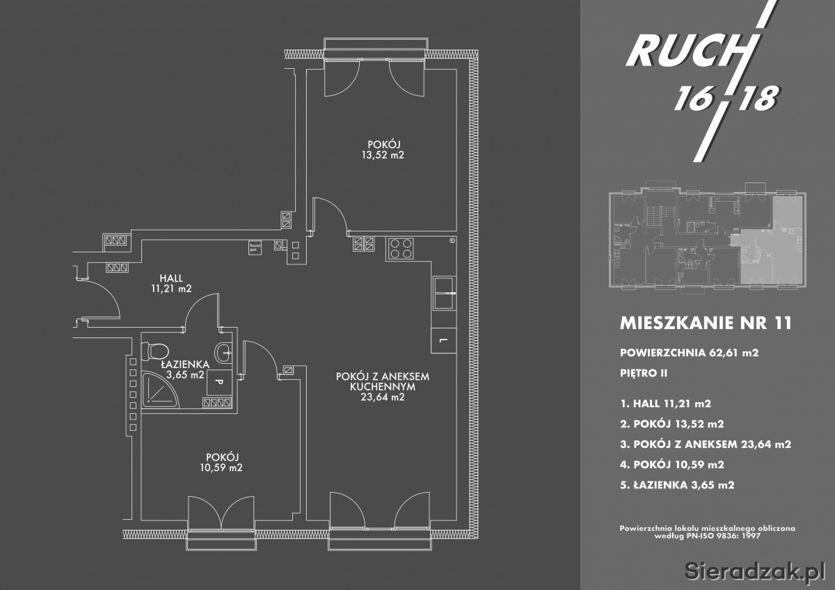 PRZESTRZEŃ DOKŁADNIE TAKA JAK TY. Szukasz wygodnej kawalerki w centrum miasta? A może wygodnego lokalu, który będzie jednocześnie domem i biurem? Przestrzennego mieszkania, w którym pomieści się rodzina i dwa psy? W inwestycji „RUCH 16-18” znajdziesz mieszkania jedno-,dwu-, i trzy pokojowe od 29-62 m2. Funkcjonalne, ustawne mieszkania, które łatwo urządzisz, zgodnie ze swoimi upodomaniami i gustem. Dogodne usytuowanie budynku sprawia, że wszędzie masz blisko: nie musisz spędzać życia w samochodzie albo komunikacji miejskiej, aby dostać się tam, gdzie chcesz być. Monitorowane miejsce parkingowe na dziedzińcu nieruchomości dedykowane do każdego lokalu mieszkalnego rozwiąże problemy z parkowaniem twojego pojazdu. Lokale w tej inwestycji zostały wykonane z zastosowaniem produktów wiodących producentów branży budowlanej takich jak VEKA (OKNA TRZYSZYBOWE), KMT STAL ( DRZWI WEJŚCIOWE DO LOKALI MIESZKALNYCH), KNAUF ( TYNKI GIPSOWE I SYSTEM OCIEPLENIA), ALUPROF( STOLARKA ALUMINIOWA) CERAMIKA TUBĄDZIN ( PŁYTKI CERAMICZNE). Dołożyliśmy wszelkich starań aby prace budowlane zostały wykonane z ogromną starannością i funkcjonalnością. Nowoczesna, dobrze doświetlona, przestronna klatka schodowa z szerokimi schodami prowadzącymi do lokali daje poczucie ogromnej swobody poruszania się po kondygnacjach budynku, a nowoczesne wykończenie części wspólnych sprawia że odczuwamy komfort przestrzeni, bardzo potrzebnej do codziennego funkcjonowania w budynku wielorodzinnym. Wszystkie lokale zostały wyposażone w klimatyzatory inwerterowe posiadające funkcję chłodzenia oraz grzania zapewniające komfort termiczny. Media dla inwestycji: Energia elektryczna PGE Sp. z o.o. Ogrzewanie gazowe PSG Sp. z o.o. - indywidualne dla każdego lokalu, piec dwu-funkcyjny z możliwością dołożenia automatyki SMART, w celu optymalnego i indywidualnego zarządzania temperaturą w lokalu. Budynek będzie przekazany w zarządzanie Wspólnocie Mieszkaniowej, co spowoduje że mieszkańcy będą mięli realny wpływ na podejmowanie decyzji dotyczących kosztów funkcjonowania inwestycji. Lokale Mieszkalne spełniają wymogi techniczne pomieszczeń przeznaczonych na stały pobyt ludzi, określone w przepisach ustawy z dnia 7 lipca 1994 r. Prawa Budowlanego.