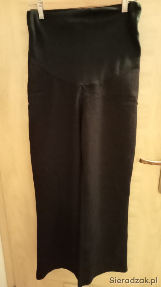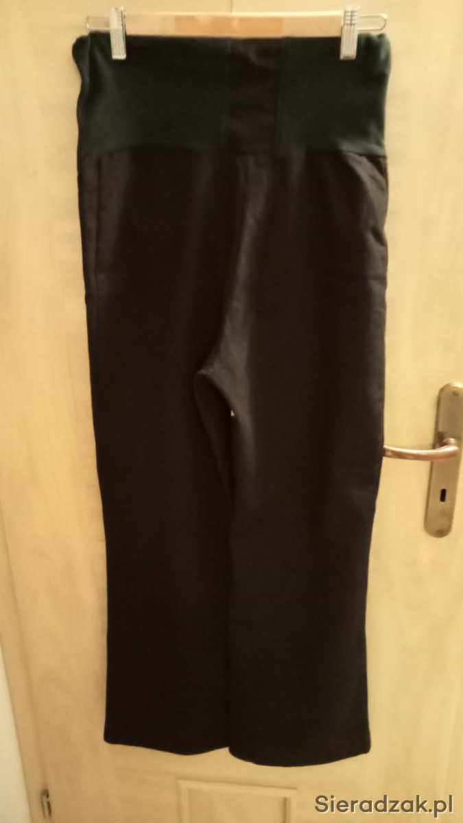 Spodnie damskie ciążowe czarne z materiału, góra z dzianiny, z tyłu regulowane na taśmę z guzikiem, rozmiar 38