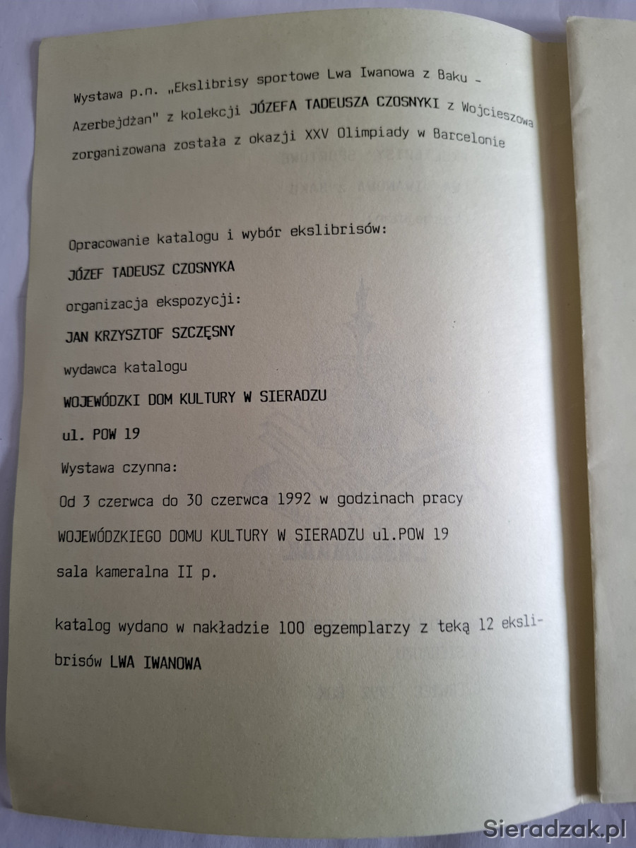Ekslibrysy wydane z okazji olimpiady w Barcelonie. 12 szt ekslibrysów. Wydawnictwo Wojewódzkiego Domu Kultury w Sieradzu - z 1992. Nakład 100 egzemplarzy.