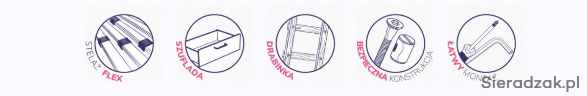 TAMI to popularny model również przez wzgląd na swoją solidną i bezpieczną konstrukcję. Górne łóżko ma wysoką przedłużoną barierkę, która chroni przed upadkiem podczas snu, a mocna drabinka zapewnia swobodne wchodzenie i schodzenie. Dodatkowym atutem jest możliwość rozłożenia łóżka na dwa pojedyncze, jeśli zajdzie taka potrzeba.