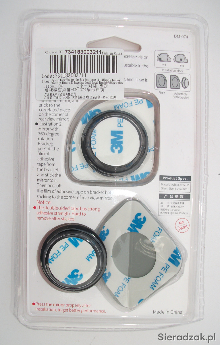 Lusterka są montowane za pomocą silnej i trwałej taśmy 3M.
