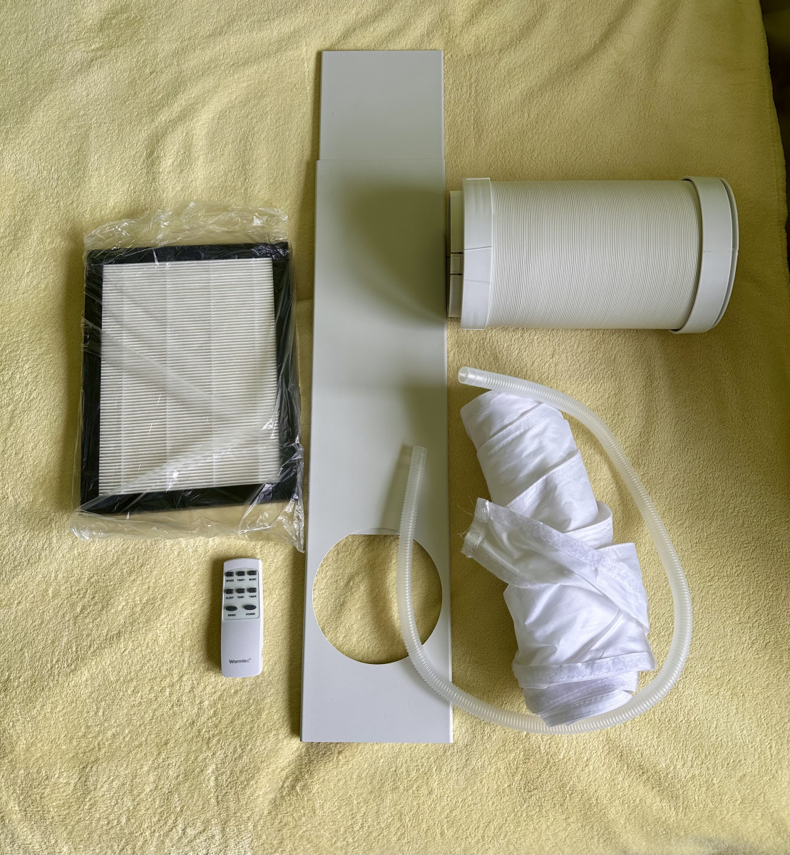 W zestawie: rura do odprowadzania ciepła wraz z końcówkami, wężyk odpływowy, nowy filtr HEPA, pilot do zdalnego sterowania, używana materiałowa uszczelka na okno . Elektroniczna instrukcja obsługi w formacie pdf - mogę podesłać e-mailem.