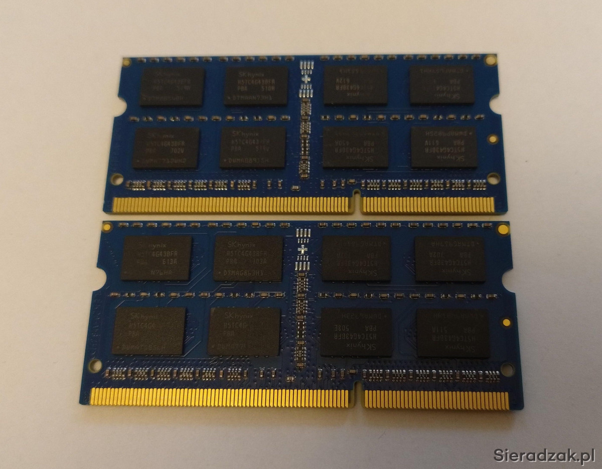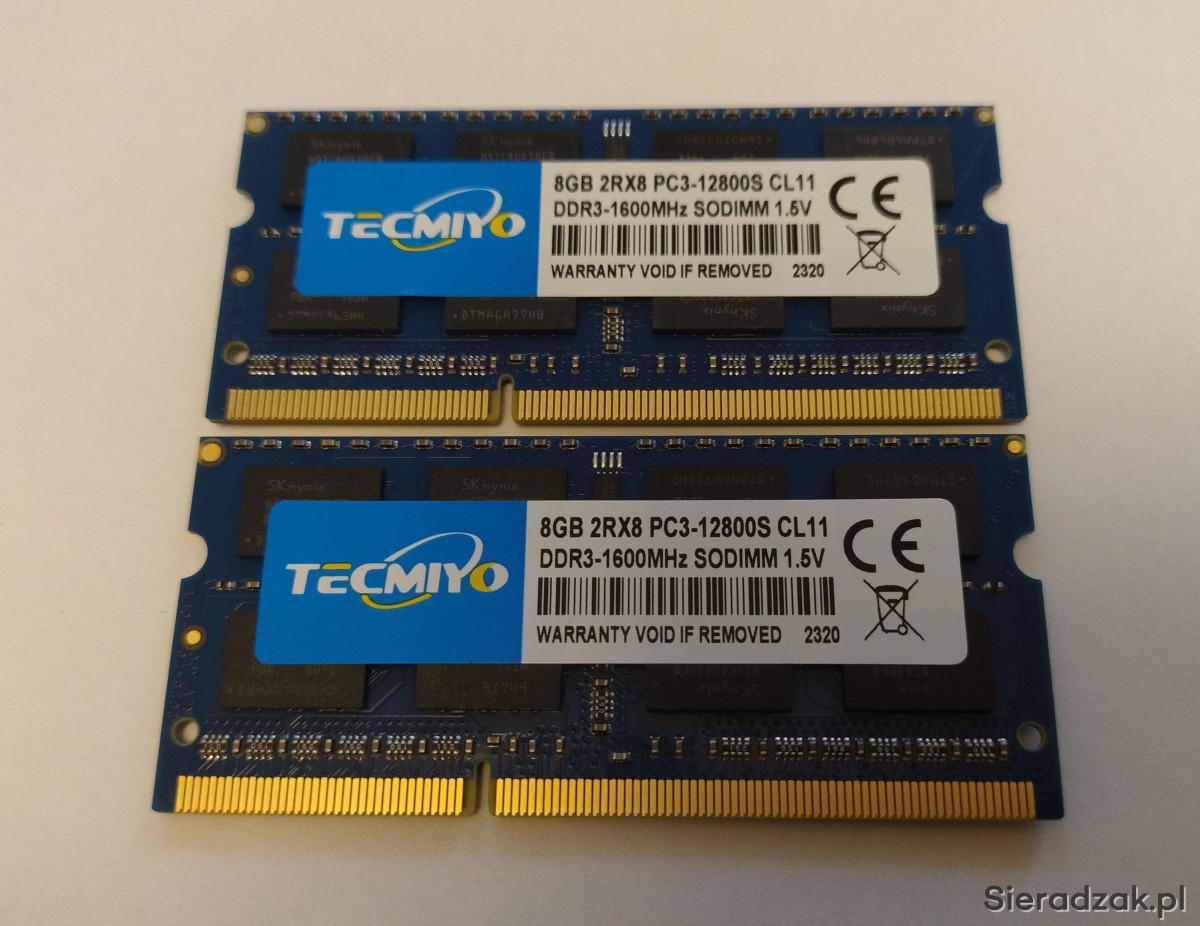 Na sprzedaż posiadam w 100% sprawne pamięci RAM do laptopa firmy Tecmiyo o pojemności 16 GB (2 X 8 GB) DDR3 1600 MHz PC3-12800S 2RX8 SODIMM CL 11, 1,5V Non-ECC, które zbudowane na wysokiej jakości kościach firmy SK Hynix.