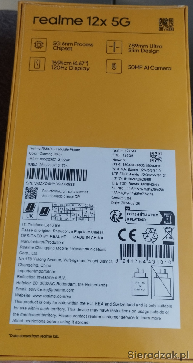 Mam na sprzedaż nowy smartfon Realme 12x 5G 6GB/128GB w kolorze czarnym w oryginalnym opakowaniu. Pojemność baterii 5000 mAh, aparat główny 50Mpix, aparat przedni 8Mpix, typ USB-C. Odbiór osobisty lub wysyłka przez Paczkomat.