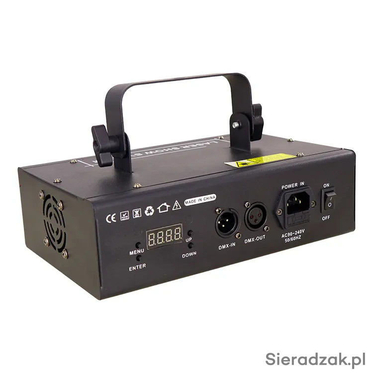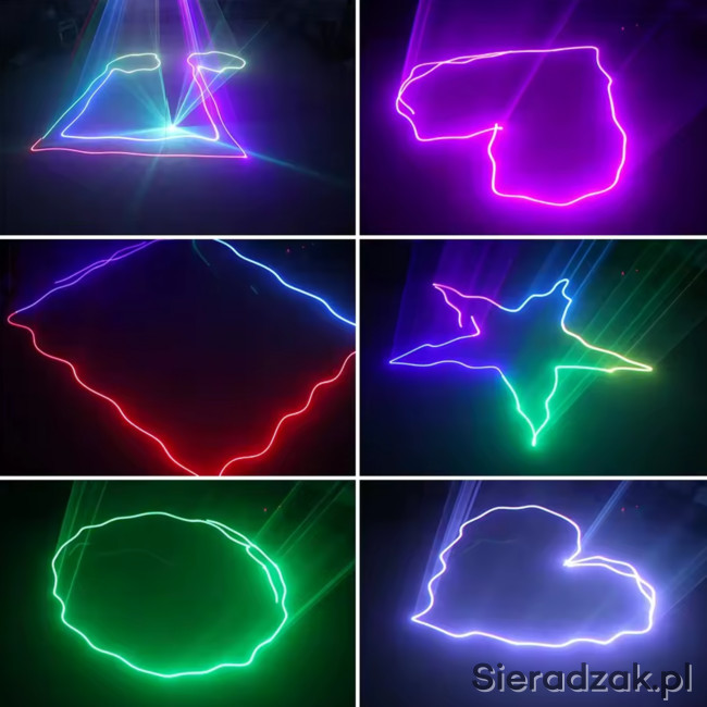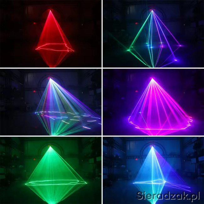 Laser z czerwoną, zieloną i niebieską diodą laserową RGB oraz 51 - wbudowanych efektownych wzorów sterowanych automatyczne lub dźwiękiem. Sterowanie muzyką przez wbudowany mikrofon, regulowana czułość. Wytwarza różne wzory geometryczne złożone z punktów i linii oraz wiele dodatkowych efektów. Dzięki temu posiada duże możliwości pracy w każdych warunkach. Każdy użytkownik będzie z pewnością zadowolony mając możliwość użycia wszystkich efektów na każdej imprezie. Doskonale sprawdza się jako oświetlenie sceniczne w domach i ośrodkach kultury, podczas koncertów, różnego typu występów, gali i prezentacji, a także w klubach tanecznych, dyskotekach oraz jako oświetlenie dla mobilnych DJ-ów, zespołów i firm eventowych itp.