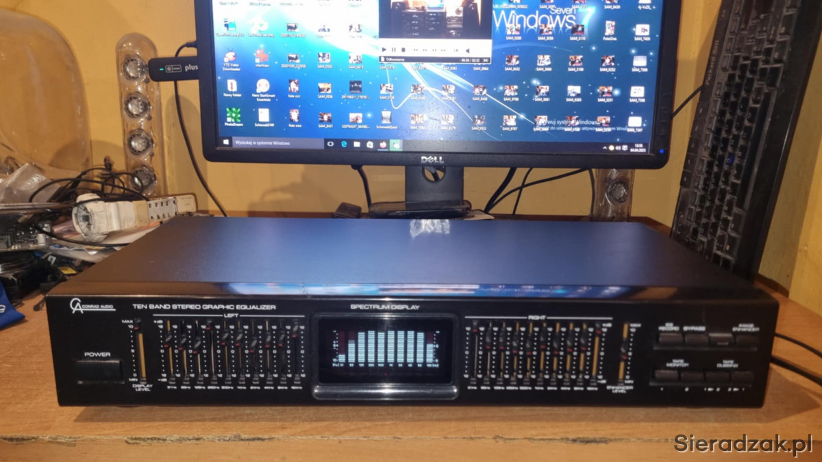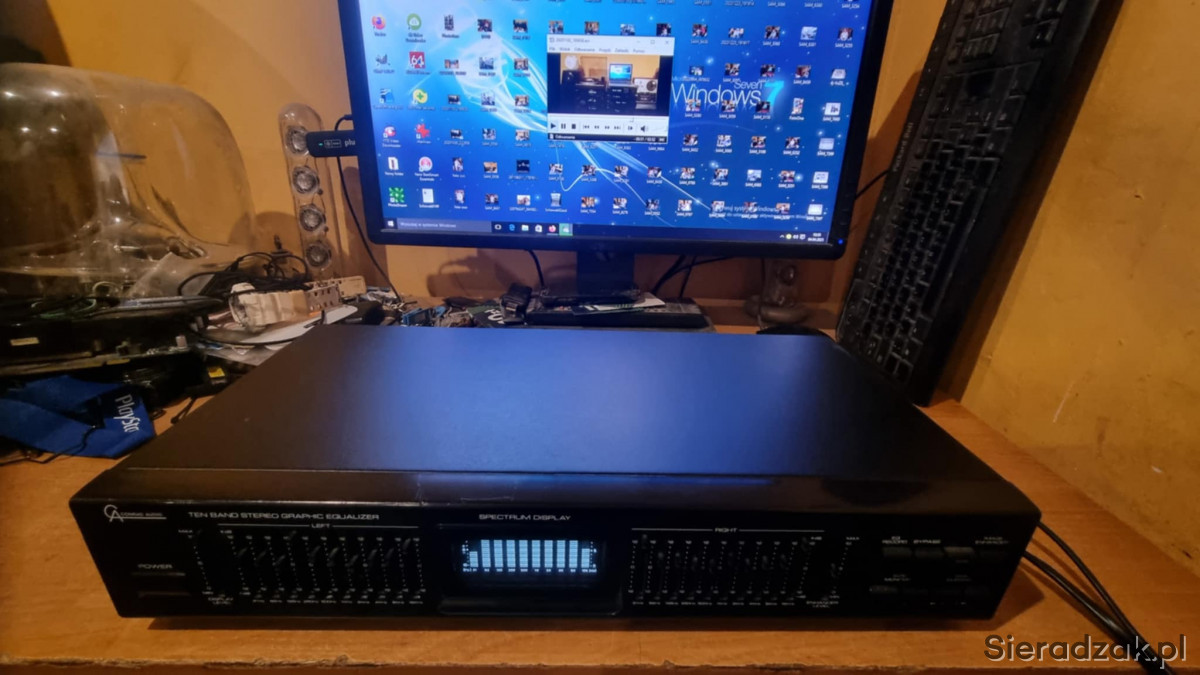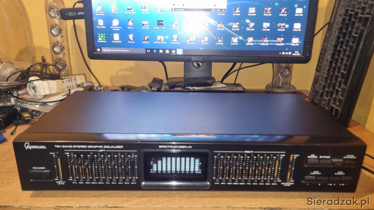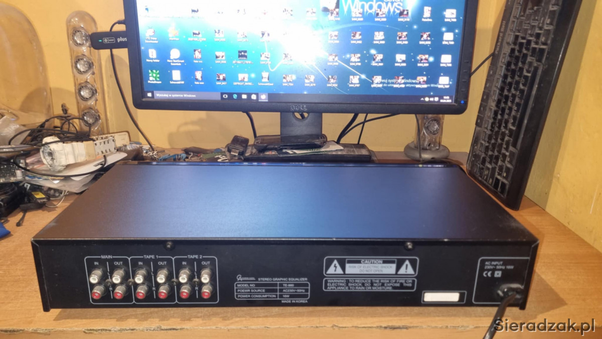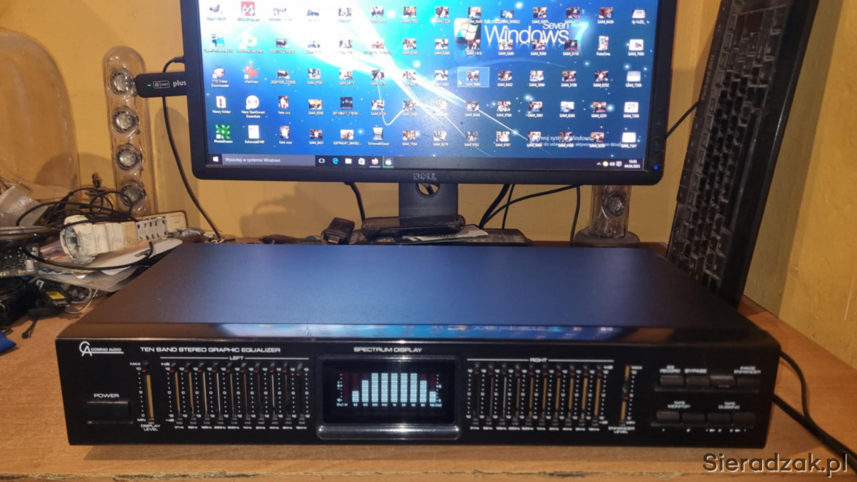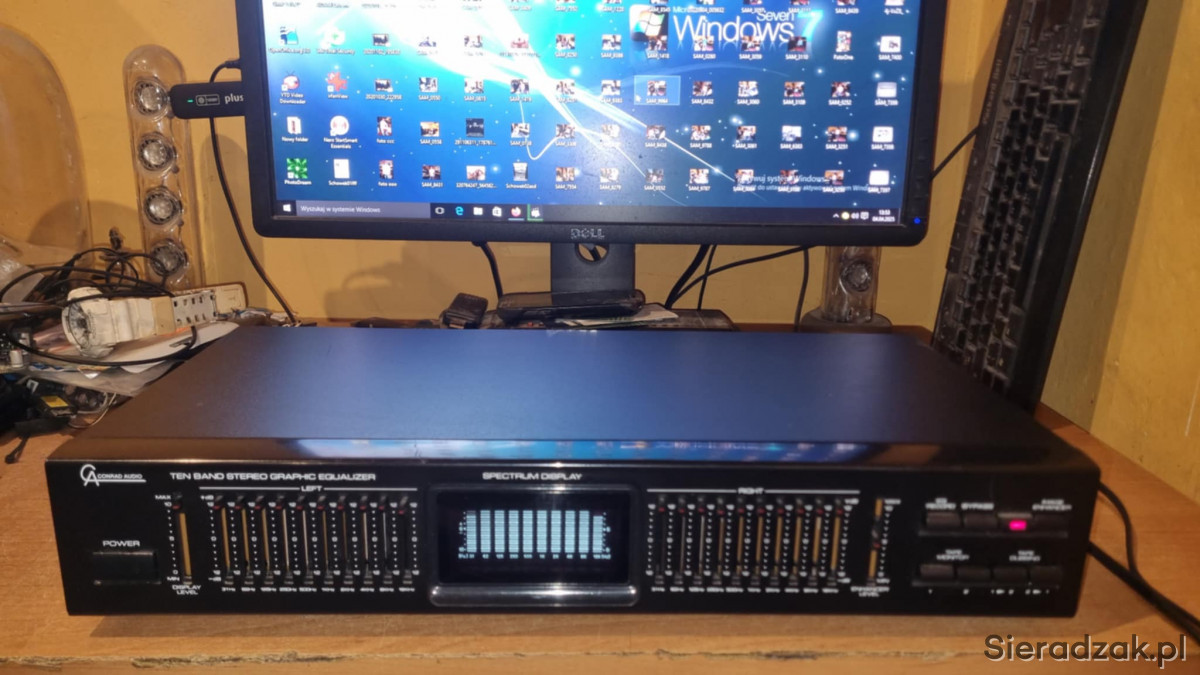 Korektor, equalizer marki Conrad Audio, model CA TE-980 Urządzenie jest sprawne, wszystkie funkcje korektora działają bez zarzutu, po prostu robi to co do niego należy :) Dodatkowo posiada regulowaną funkcję enhancer coś jakby poszerzanie sceny stereo którą oczywiście można wyłączyć. Możliwość podłączenia dwóch magnetofonów. Wyświetlacz świeci jasno i klarownie, wszystkie słupki analizatora świecą idealnie.
