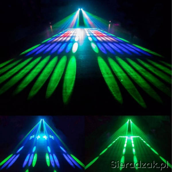 Od prawej strony efekt mix wzorów i kolorów dzięki temu oba dają duże możliwości użycia wszystkich efektów na każdej imprezie. Doskonale sprawdza się jako oświetlenie sceniczne w domach i ośrodkach kultury, podczas koncertów, różnego typu występów, gali i prezentacji, a także w klubach tanecznych, dyskotekach oraz jako oświetlenie dla mobilnych DJ-ów, zespołów i firm eventowych itp.