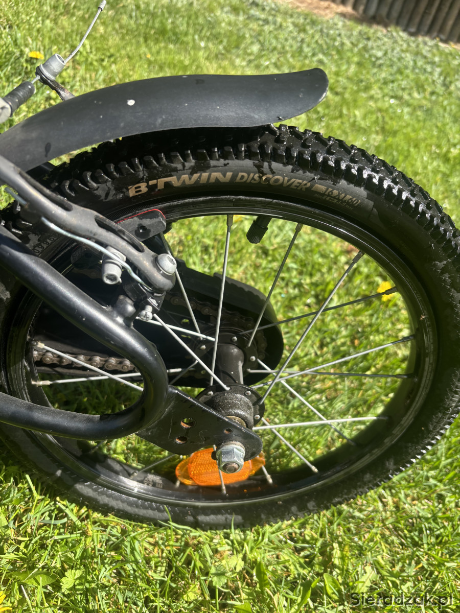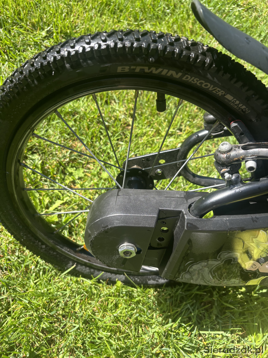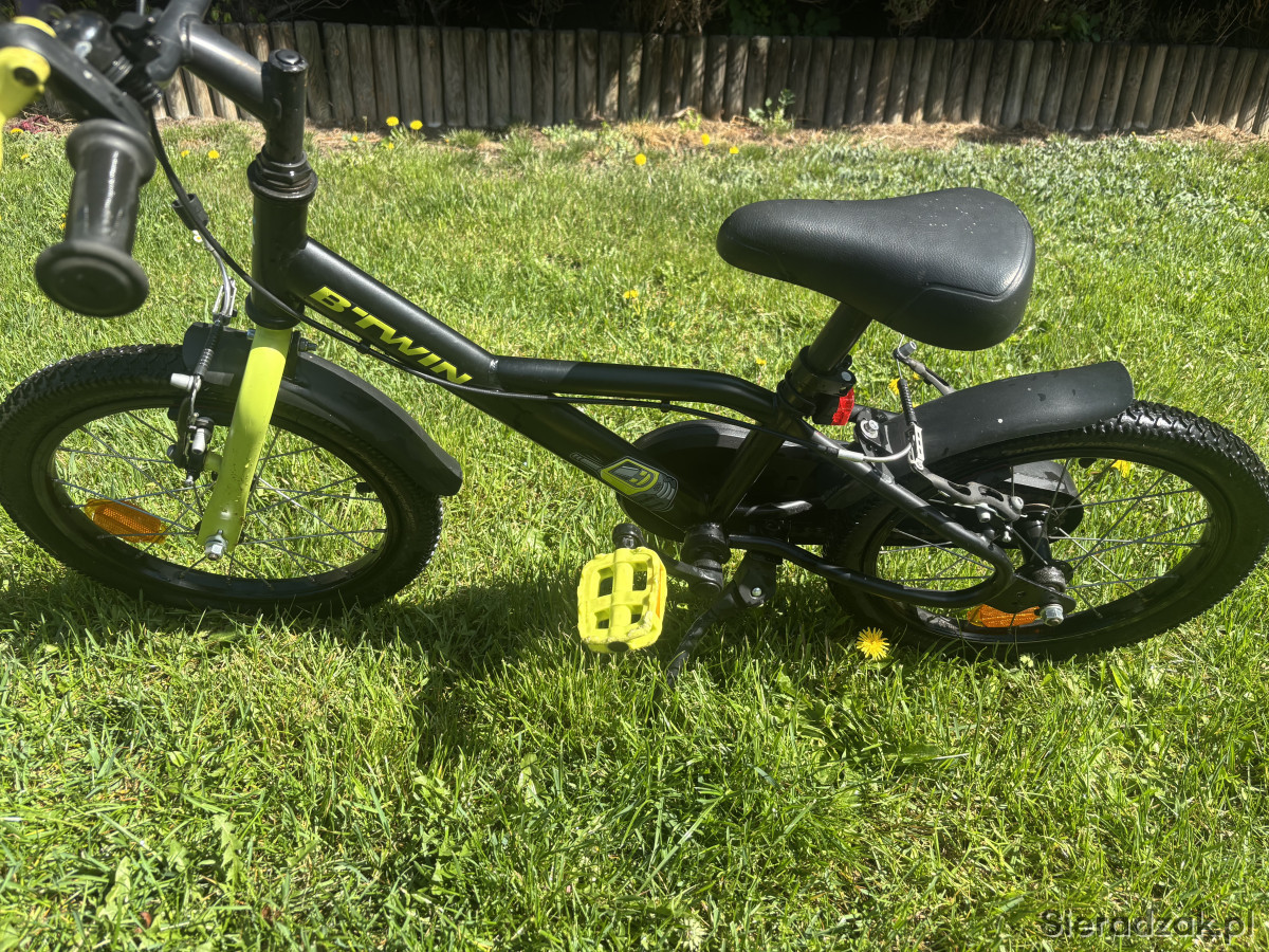 Rowerek chłopięcy. Sprawny. Zawiera widoczne ślady użytkowania. Prawdopodobnie 16 calowy. Posiada nóżkę