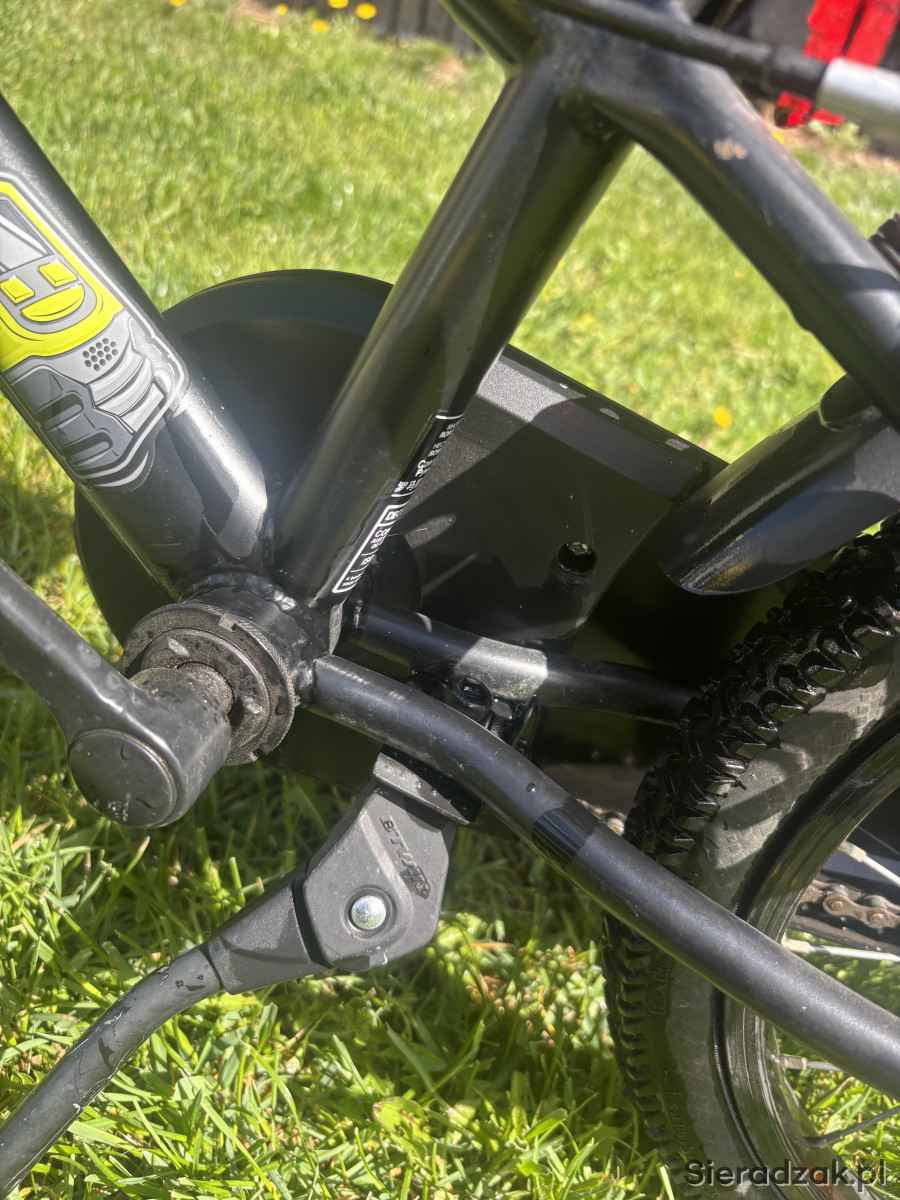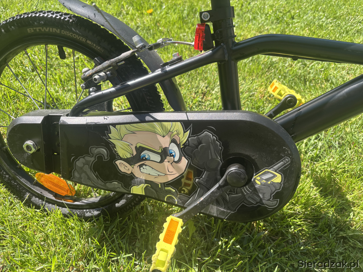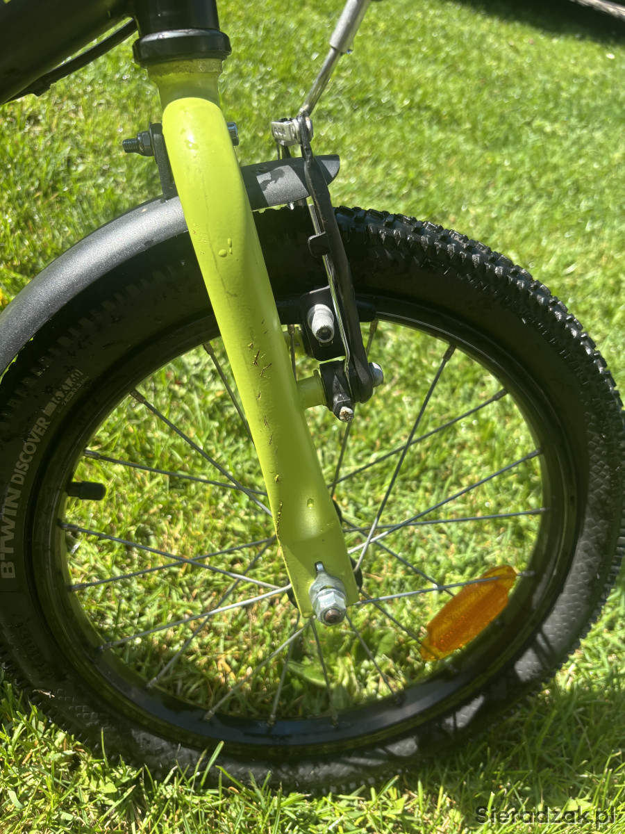 Rowerek chłopięcy. Sprawny. Zawiera widoczne ślady użytkowania. Prawdopodobnie 16 calowy. Posiada nóżkę