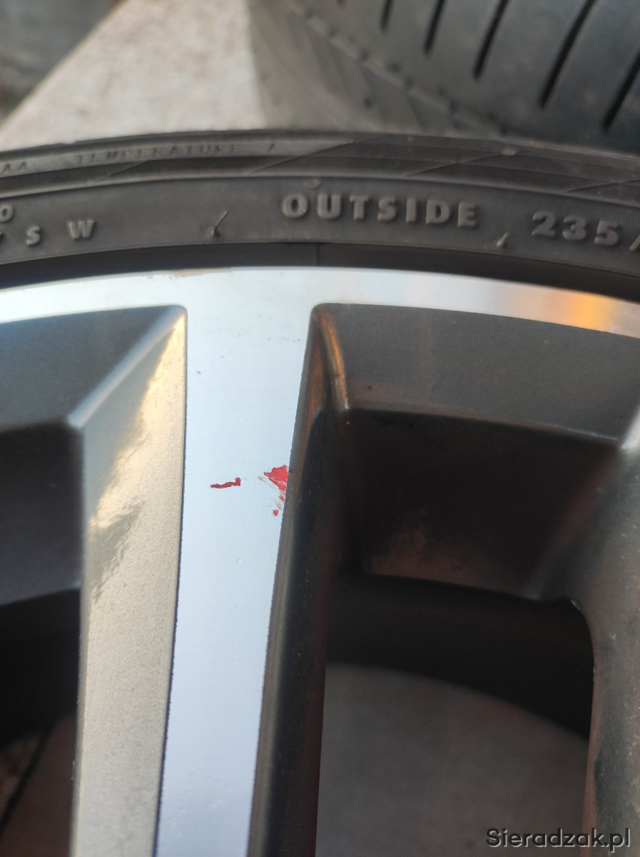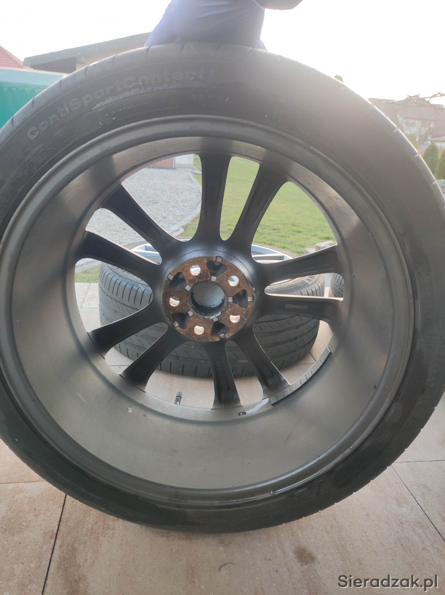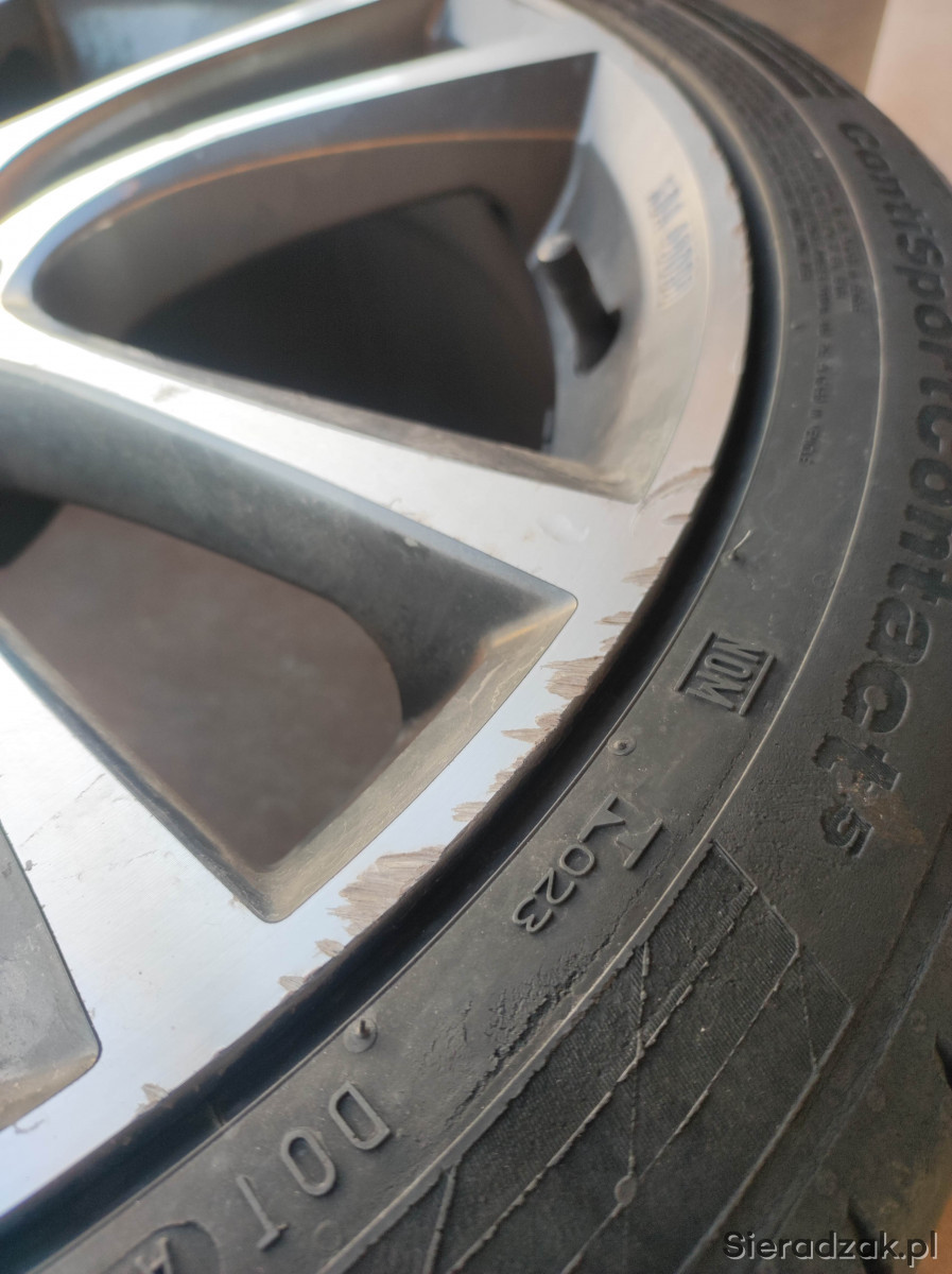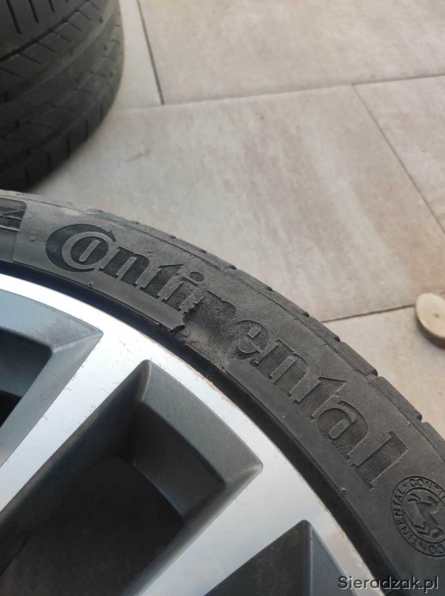 Opony Continental (2011r., 235/40 R19, bieżnik 4-5mm). Jedna opona na pewno do wymiany z racji uszkodzenia - widoczne na zdjęciu. Sprzedaję je w komplecie z alufelgami.