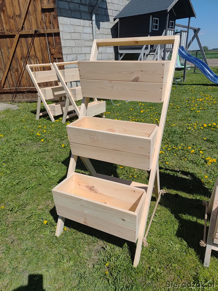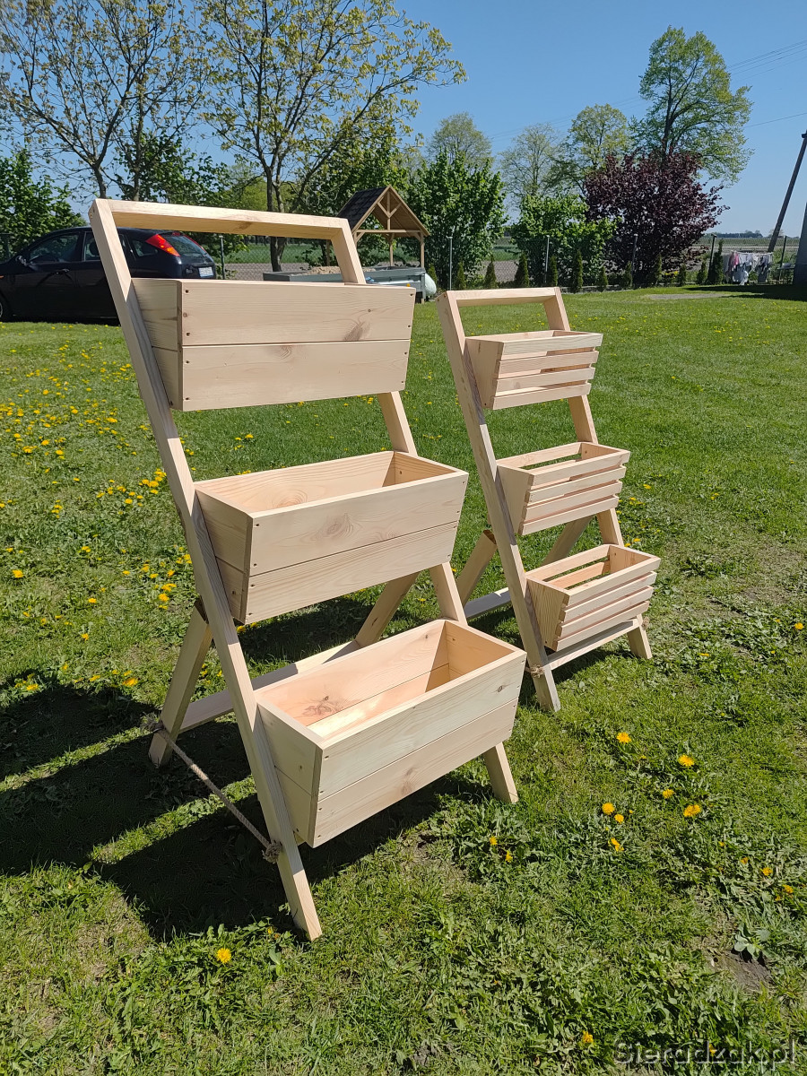 Sprzedam kwietnik ogrodowy drewniany. Kwietnik ma 130 cm wysokości. Doniczki mają 50 cm szerokości. Kwietnik jest skladany.