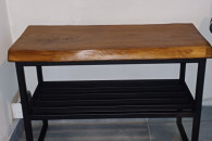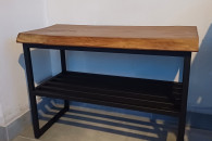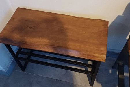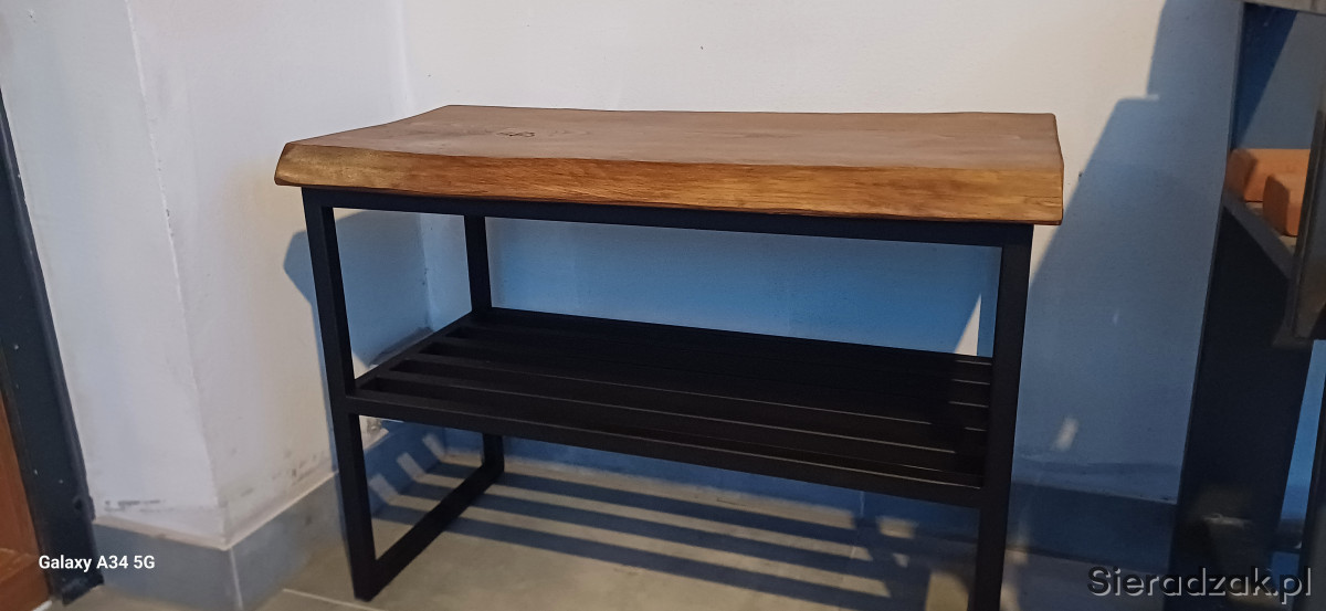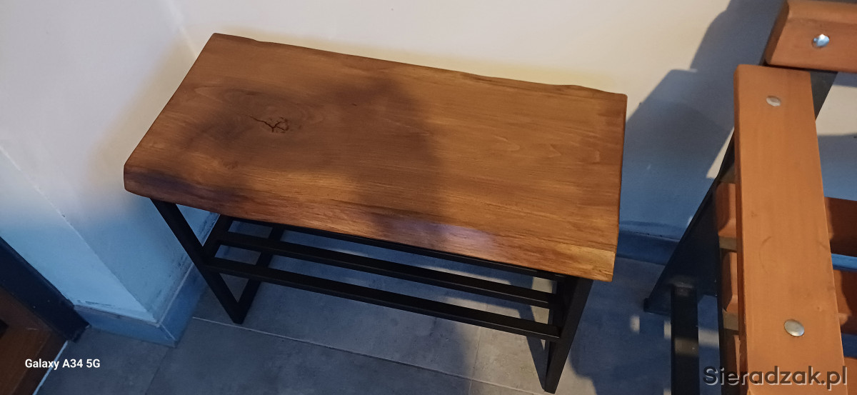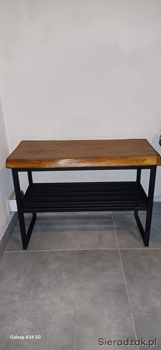 Siedzisko z półką na buty, wykonane z profila 20x20, pomalowane proszkowo na kolor czarny satynowy, blat wykonany z litego drewna bukowego zaimpregnowany lazurą żywiczna w kolorze dąb rustykalny. Krawędź blatu naturalna. Wymiary: szer. 70cm, wys. 50cm, głębokość około 33 cm. Konstrukcja sprzedawana w calosci. Możliwość odkręcenia siedziska od stelażu. Solidny i niepowtarzalny mebel. Cena 400zl