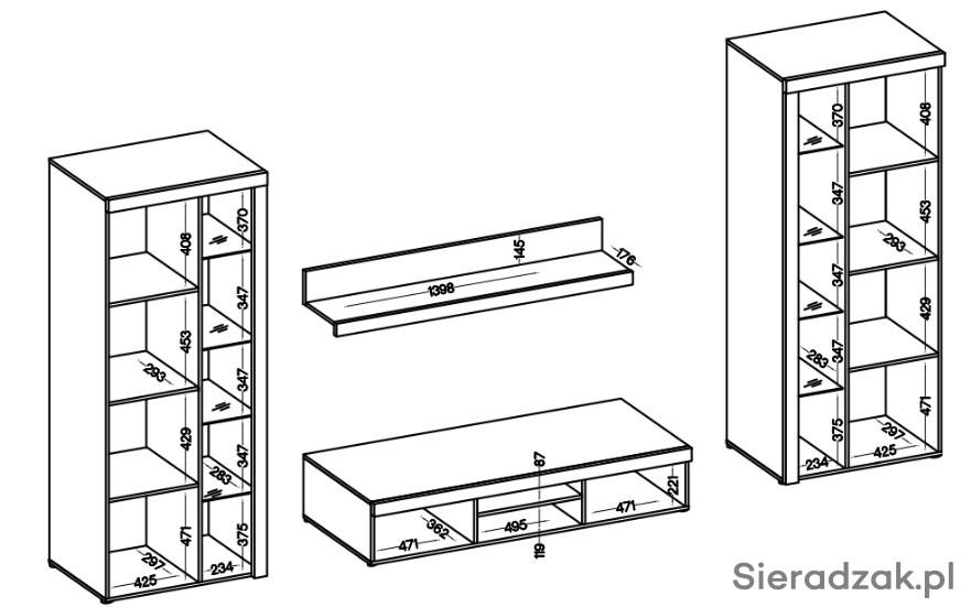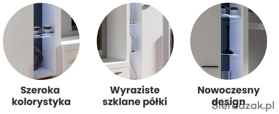 Kompozycja Rumba XL jest ponadczasowa i została zaprojektowana w 4 wersjach kolorystycznych: dąb sonoma, biały, dąb lefkas, beton jasny + biały. W skład meblościanki Rumba XL wchodzą 2 wysokie witryny stojące, stolik RTV oraz półka wisząca. Całość tworzy doskonały zestaw dla wszystkich łaknących ogromnej ilości miejsca do przechowywania. Kompozycja została wykonana z wysokiej jakości płyty laminowanej 15mm odpornej na zanieczyszczenia. Meblościanka posiada szklane półki, które opcjonalnie możesz podświetlić oświetleniem LED, stwarzając tym samym reprezentacyjne miejsce na pamiątki z wakacji, ulubione dekoracje lub kosztowności. Wszechstronny stolik RTV pozwala na umieszczenie telewizora w centralnym punkcie salonu, a wygodne półki dają możliwość łatwego podłączenia sprzętu multimedialnego bez widocznych kabli. Meblościanka Rumba XL to geometryczna harmonia i idealna kompozycja dla wielbicieli eleganckiego minimalizmu.