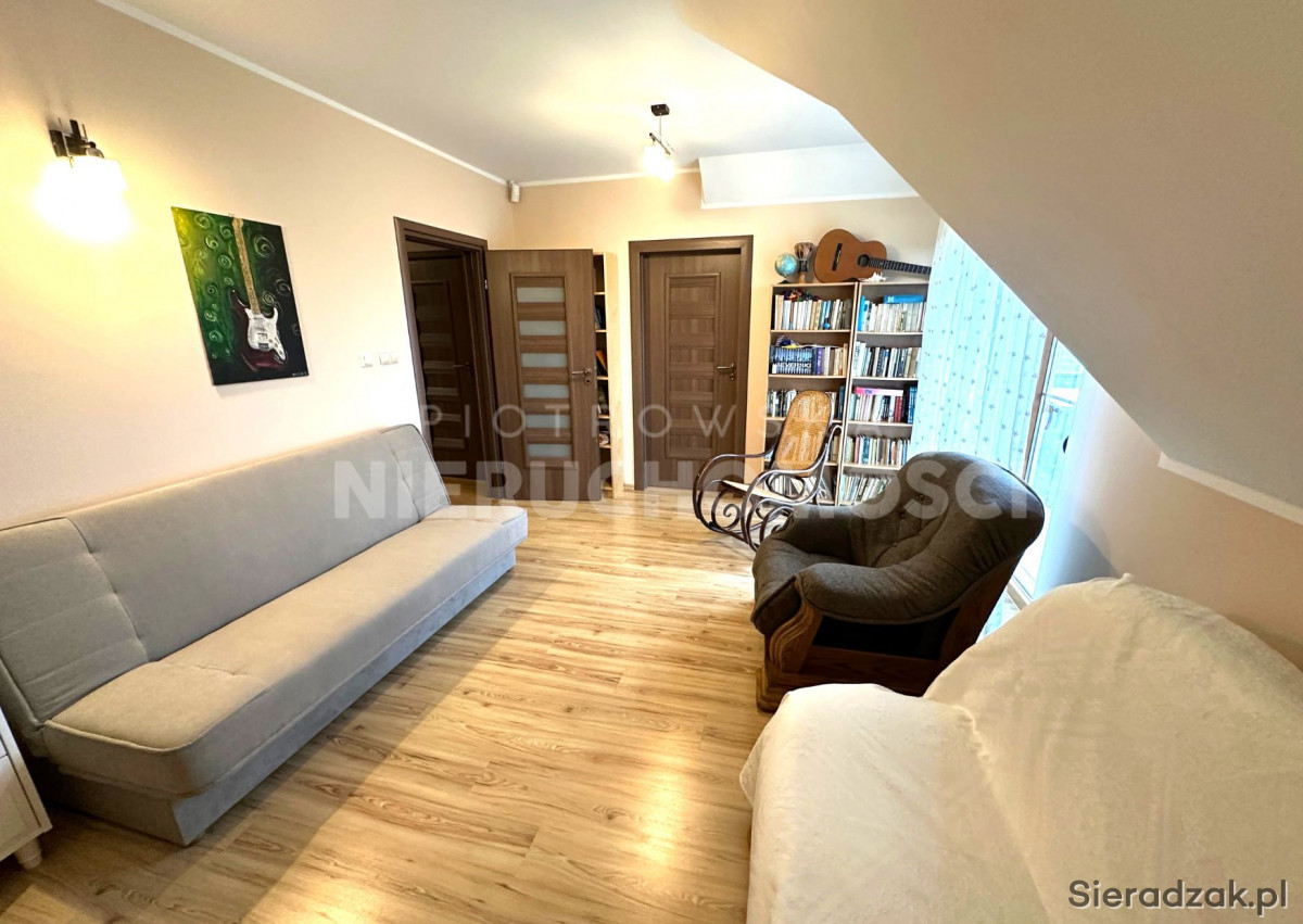 Dom położony jest na działce z wjazdem od południa – idealne ustawienie względem stron świata. Otoczenie to cicha, zielona okolica, sprzyjająca odpoczynkowi po pracy, a jednocześnie zapewniająca szybki dojazd do Warty, Sieradza i innych pobliskich miejscowości.