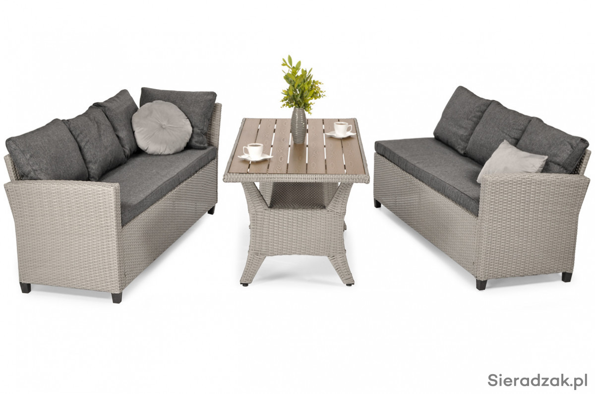 W zestawie: stół ogrodowy|narożnik (lub kanapa 3-osobowa x 2 szt.)|poduszka na oparcie x 7 szt.|długa poduszka na siedzenie x 2 szt.