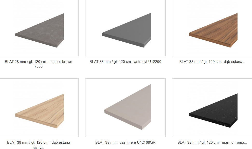 Wszystkie kuchnie w poszczególnych projektach są dostarczane w komplecie z blatami o grubości 38 mm. Blaty tych stołów wykonane są z warstwy odpornej na uderzenia i nie boją się gorących naczyń.