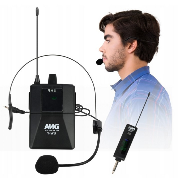 Zestaw bezprzewodowy nagłowny mikrofon z nadajnikiem mikroport przy paskowy i odbiornik jack 6.3 do podłączenia z głośnikiem kolumną aktywną, mikserem audio wzmacniaczem. Nadaje się np. do głośników JBL itp.
