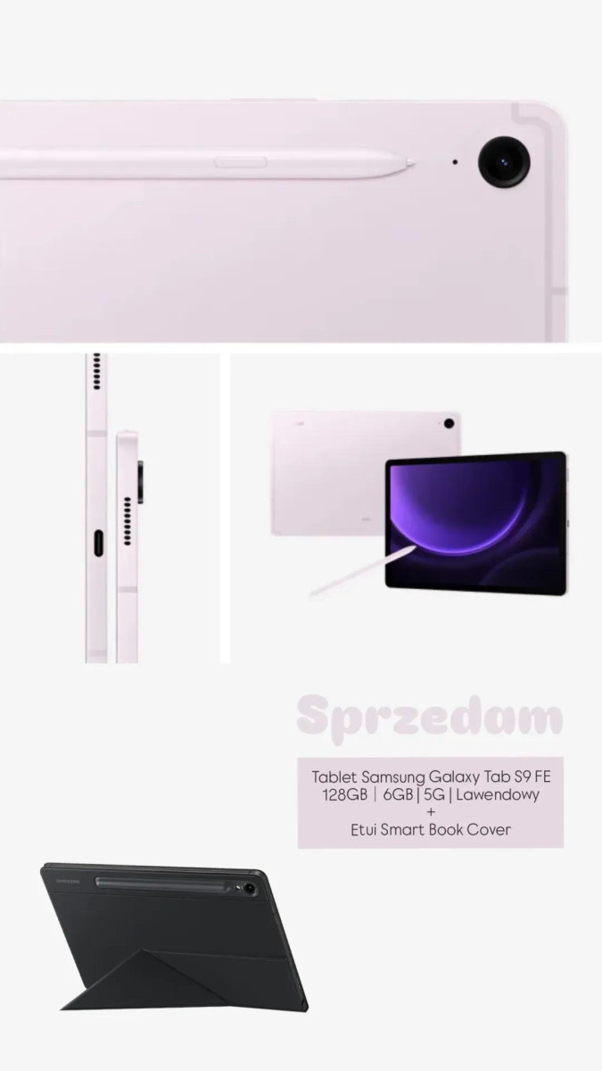 Sprzedam Samsung Galaxy Tab S9 FE 5G (SM-X516B) w eleganckim fioletowym kolorze. Kupiony w październiku 2023 r., używany sporadycznie – tylko na studiach (weekendy).