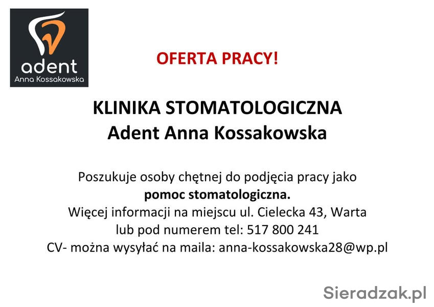 Centrum Stomatologiczne Adent Anna Kossakowska poszukuje osoby chętnej do podjęcia pracy jako pomoc stomatologiczna. Więcej informacji na miejscu Warta ul. Cielecka 43 lub pod numerem tel: 517800241.