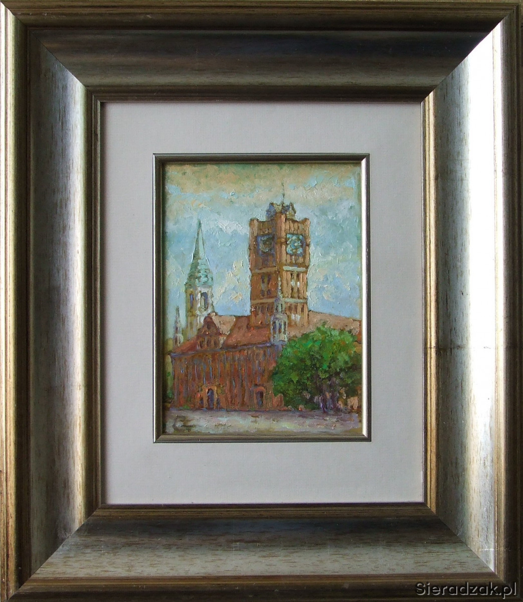 "Ratusz w Toruniu"- obraz olejny na desce,werniksowany,oprawiony w piękną i stylową,drewnianą ramę.Przedstawia fragment toruńskiego Starego Rynku z wieżą gotyckiego ratusza oraz barokową wieżą kościoła św.Ducha w tle. Format obrazu- 14,5x19,5 cm. a z oprawą 37x42 cm. Autor- Cezary Zbrojewski.