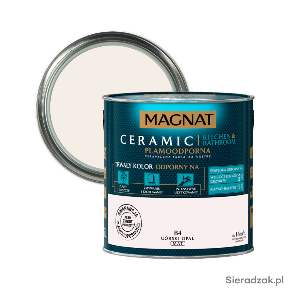 MAGNAT CERAMIC KITCHEN&BATHROOM to ceramiczna farba tworząca powłoki o hydrofobowych właściwościach, która polecana jest szczególnie d dekoracyjno-ochronnego malowania ścian i sufitów wewnątrz pomieszczeń narażonych na okresowo zwiększające się zawilgocenie i kondensację paru wodnej, jak: łazienki, pralnie czy kuchnie.