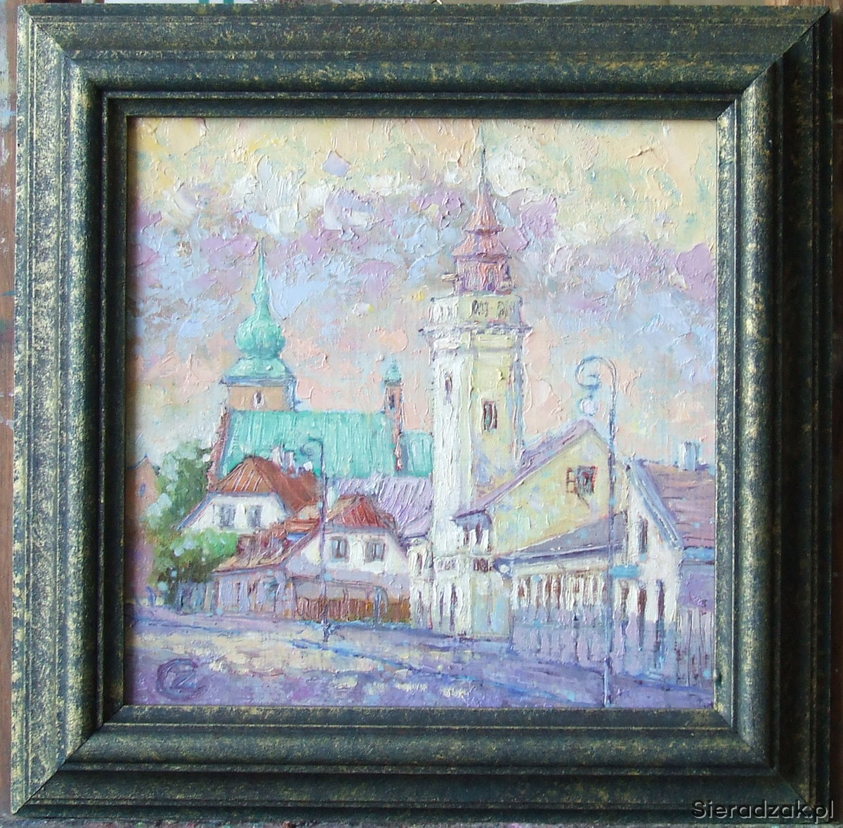 Obraz olejny na desce. Przedstawia charakterystyczny fragment ul.Krakowskie Przedmieścdie w Sieradzu, z budynkiem OSP oraz kolegiatą w tle. Obraz werniksowany, oprawiony w oryginalną, drewnianą ramę. Format obrazu -20x20cm.,a łącznie z oprawa- 28x28 cm. Autor- Cezary Zbrojewski. Stan jak na foto.