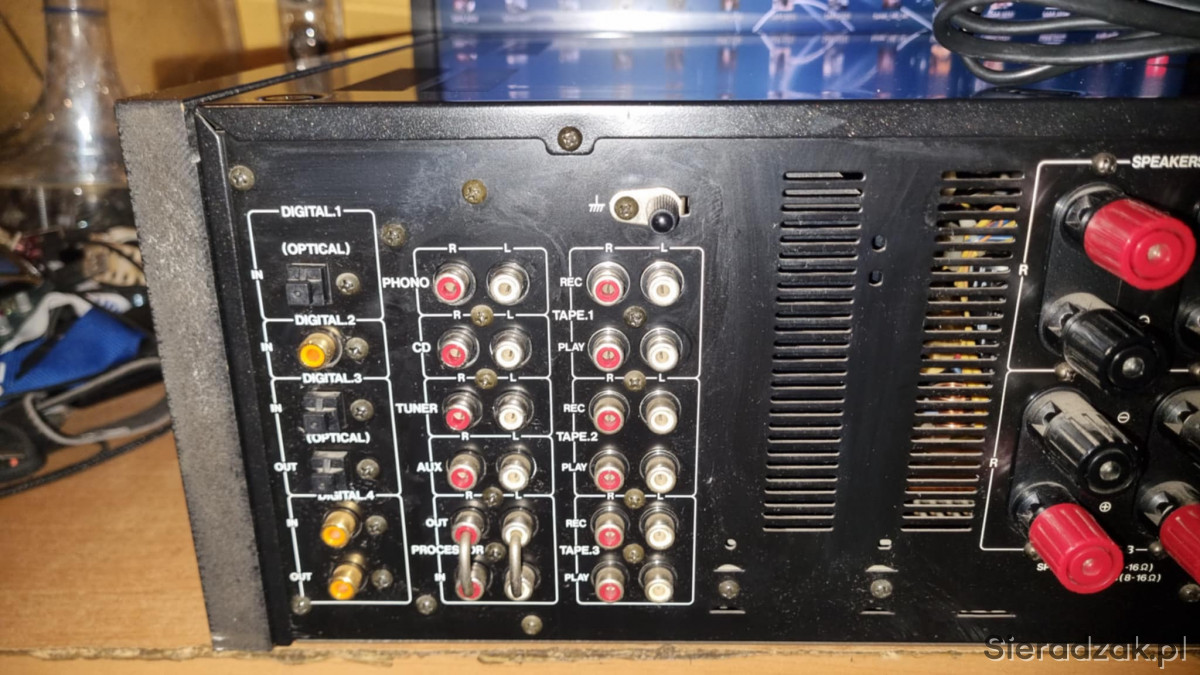 7 wejść analogowych (PHONO, CD/DVD, TUNER, AUX, TAPE/DAT-1, TAPE/MD-2, TAPE-3, procesor) 4 wyjścia analogowe (TAPE1, TAPE2, TAPE3, korektor)