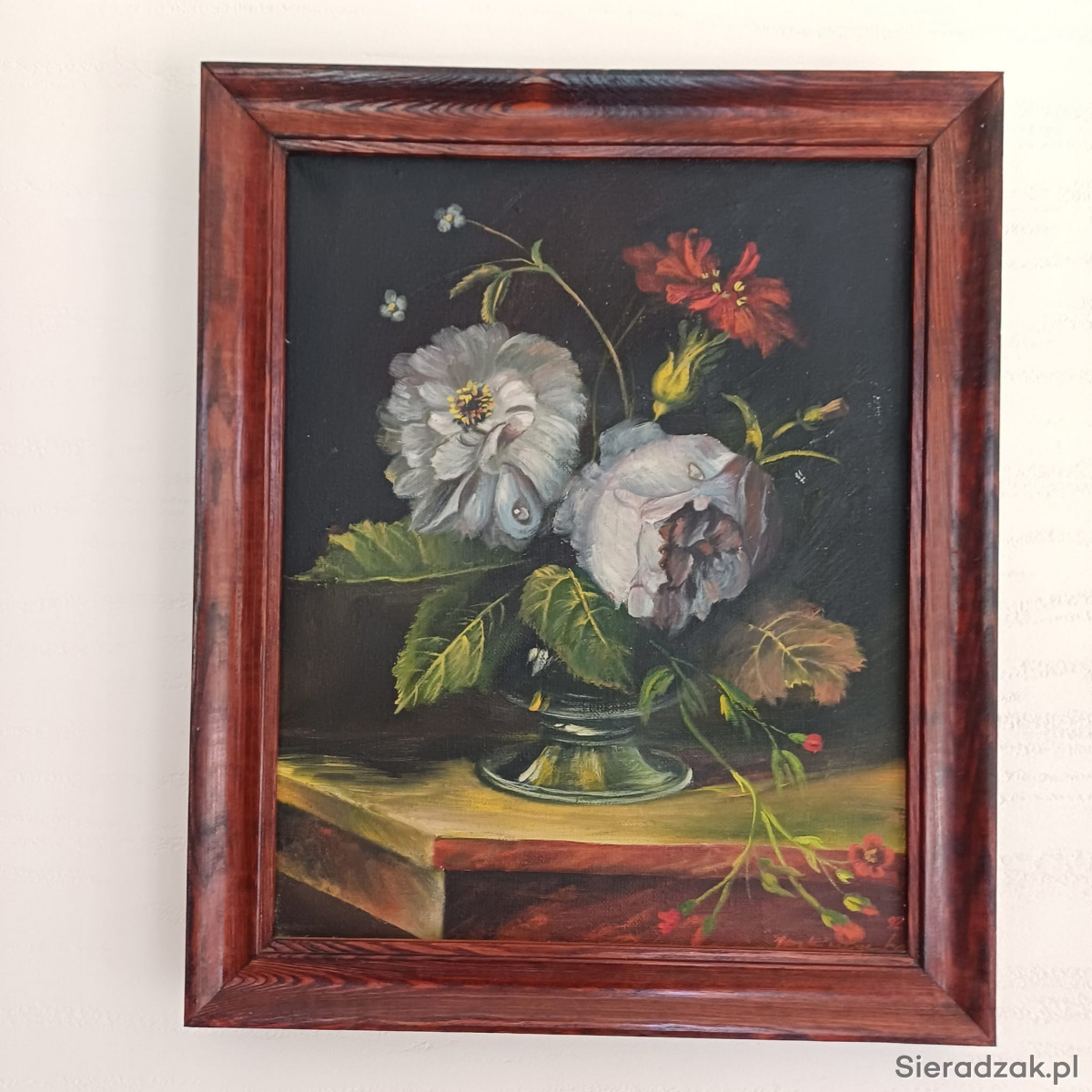 Obraz przedstawia martwą naturę z kwiatami w wazonie