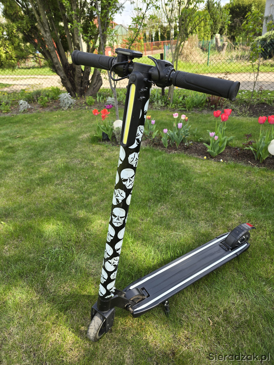 Mam do sprzedania używaną hulajnogę elektryczną. Stan dobry. Hulajnoga posiada 3 tryby jazdy (prędkości), duże światło LED z przodu, hamulec spowalniający jazdę elektryczny oraz nożny na tylnym kole. Składana, co widać na zdjęciach. W zestawie ładowarka sieciowa.