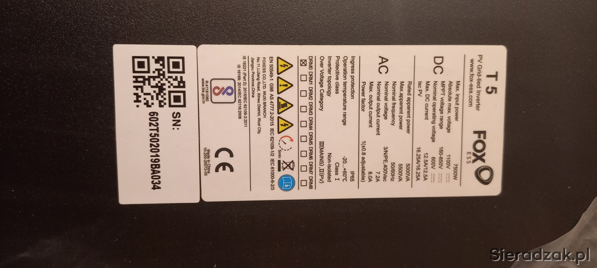 Mam do sprzedania falownik Foxess T5 /3-fazowy/ używany z powodu powiększenia ilości paneli.Jest w b.dobrym stanie.Pracował w piwnicy.Ogladac można Sieradz ul.Warszawska 9