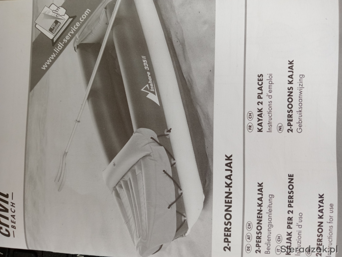 Kajak dmuchany dla dwóch osób wyposażone w jedno aluminiowe wiosło w bardzo dobrym stanie używany dwukrotnie dołączam pompkę na prąd stan bardzo dobry polecam
