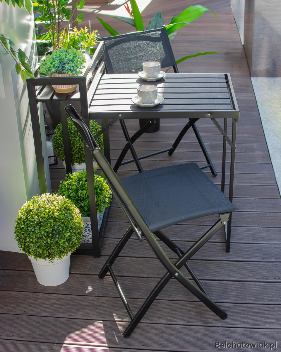 Ten zestaw mebli balkonowych łączy w sobie praktyczność i estetykę. To doskonały wybór dla osób ceniących komfort, oszczędność miejsca i nowoczesny wygląd.