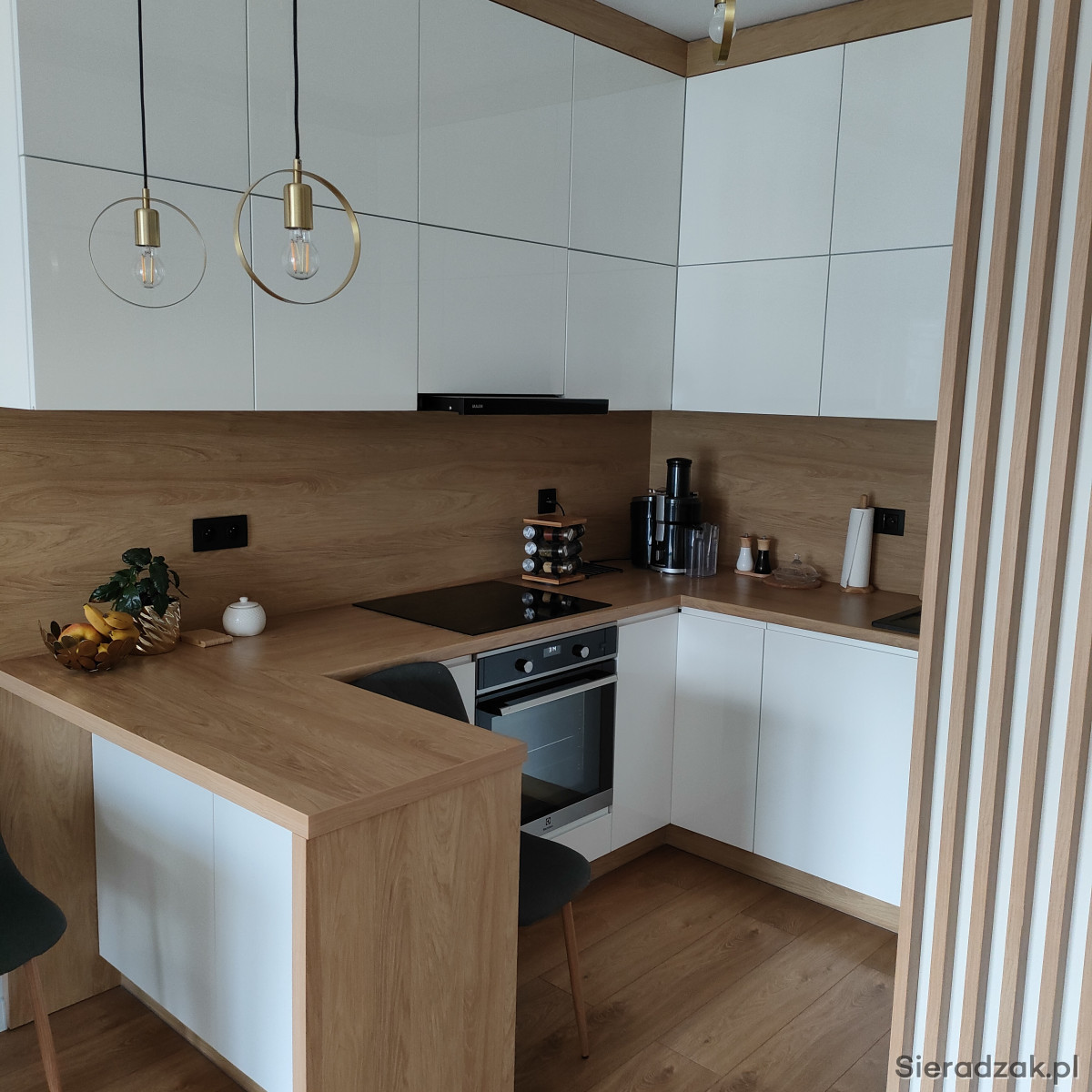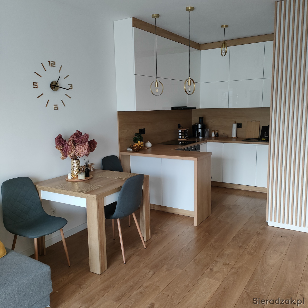 Salon z otwartą kuchnią, z całym sprzętem AGD: duża lodówka z zamrażalką, piekarnik, zmywarka, płyta indukcyjna