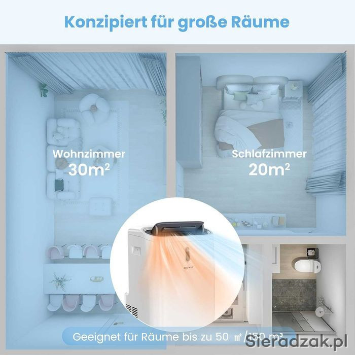 Dzięki połączeniu funkcji chłodzenia, ogrzewania, wentylatora, osuszania i trybu uśpienia ten przenośny klimatyzator może zaspokoić różne potrzeby przez cały rok. Dzięki wydajnej pojemności chłodzenia 16 000 BTU ten przenośny klimatyzator może równomiernie i szybko schłodzić powierzchnię do 50 m². Zakres temperatur od 16 oC do 32 oC.
