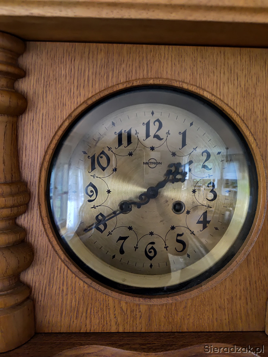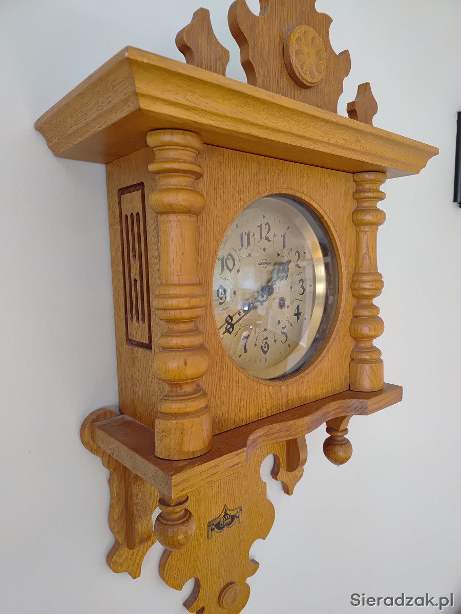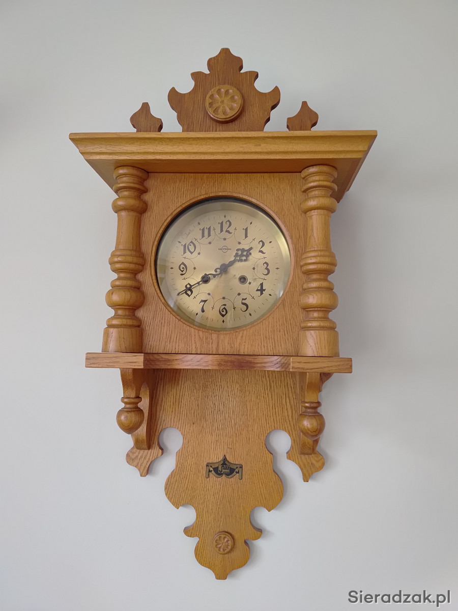 Stylizowany zegar ścienny z kukułką z 1985 r., fornirowany naturalnym drewnem w kolorze dębu, wykonany w FWiZ MERTON w Toruniu. Wymiary: wysokość 85 cm, szerokość górna półka 42 cm, obudowa mechanizmu 32 cm. Zegar sprawny ale nie używany od 25 lat, do serwisu i czyszczenia. Brak klucza do nakręcania (można zastąpić lub dokupić), wahadełko do zawieszenia. Do wglądu oryginalna karta gwarancyjna wydana w styczniu 1986 r. Polecam