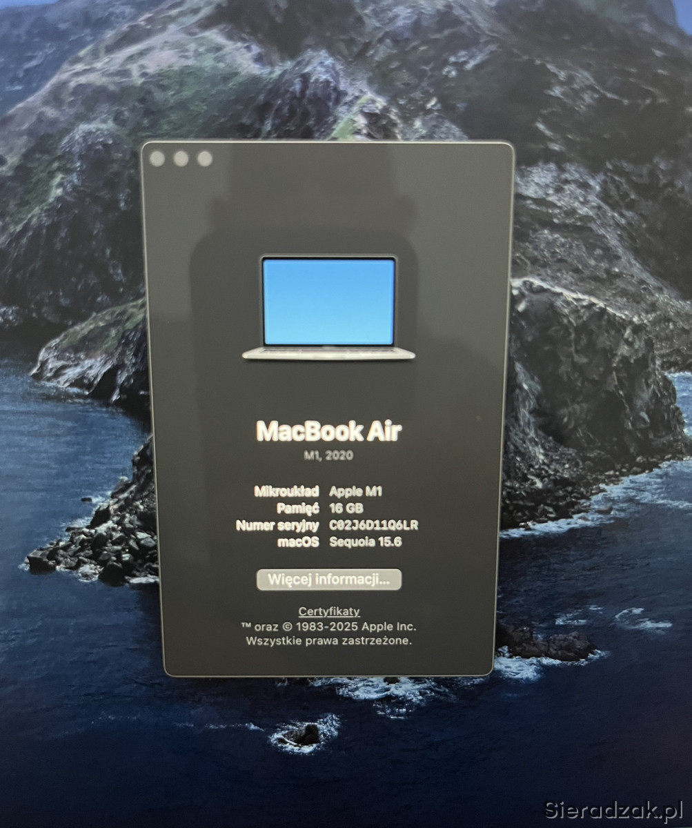 Do sprzedania Laptop APPLE MacBook Air 13.3" Retina M1 16GB RAM 256GB SSD macOS Gwiezdna szarość. Stan bardzo dobry, kondycja baterii 86%.