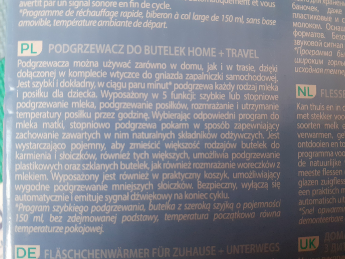Podgrzewacza można używać w domu jak i trasie, dzięki wtyczce do gniazda zapalniczki samochodowej. Podgrzewa mleko i posiłki dla dziecka. Wyłącza się automatycznie emitując sygnał na koniec cyklu. Ma 5 funkcji. Szczegóły opisu dołączone na zdjęciu