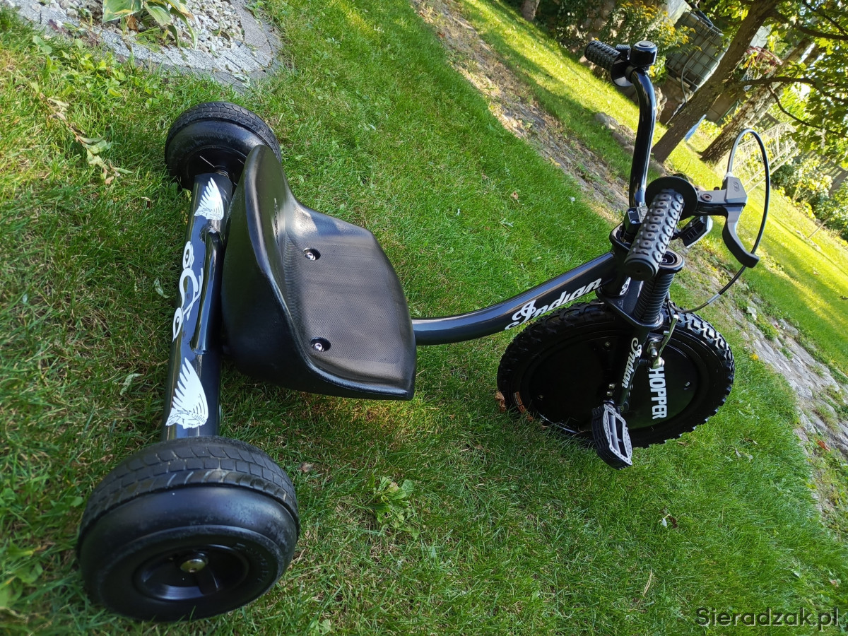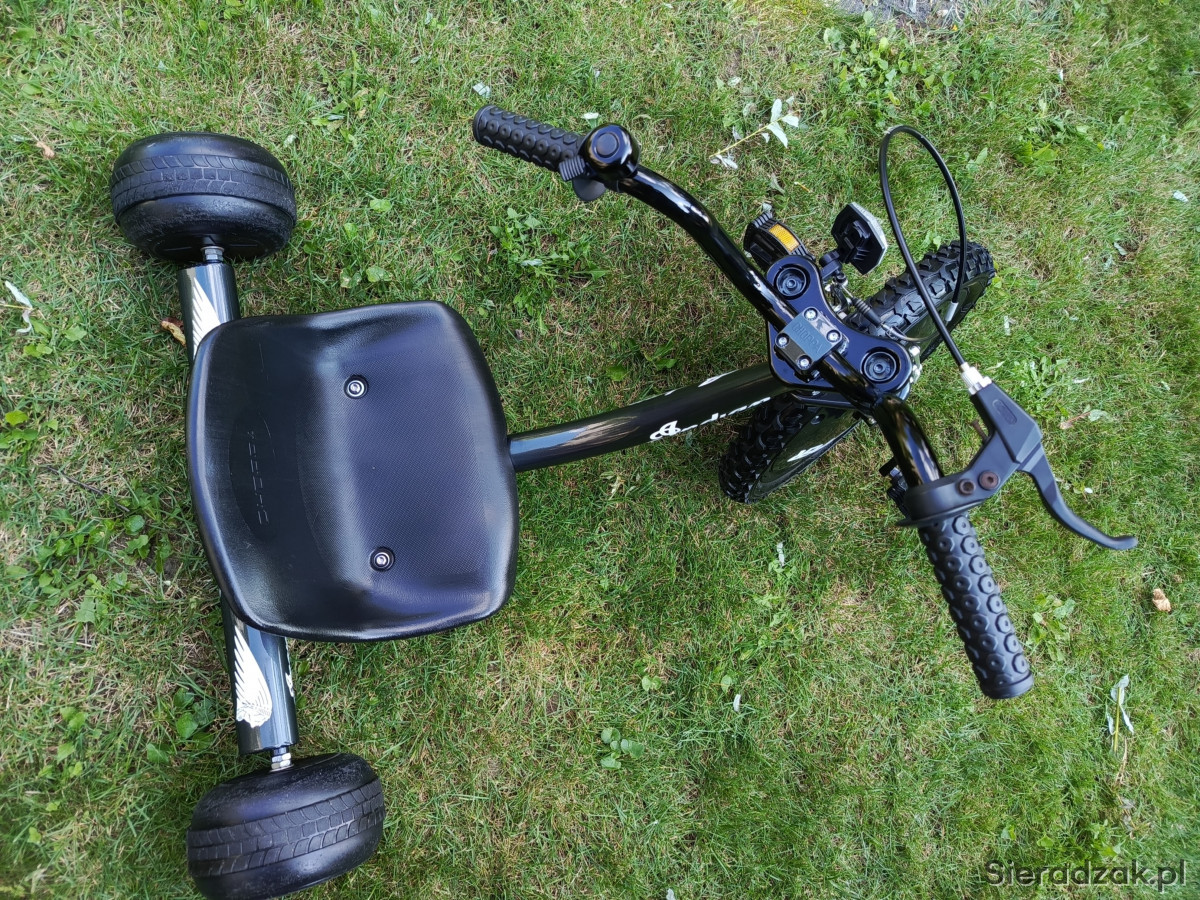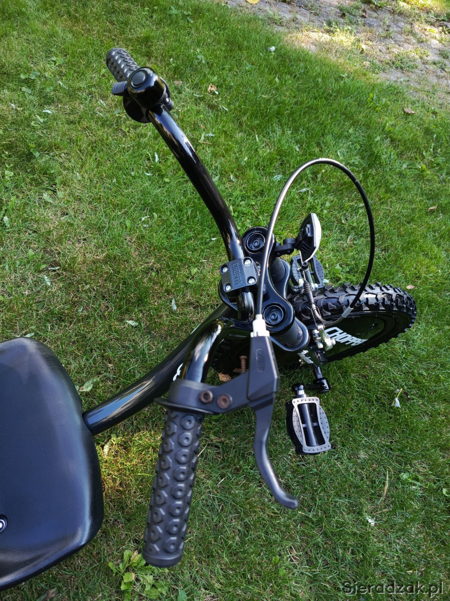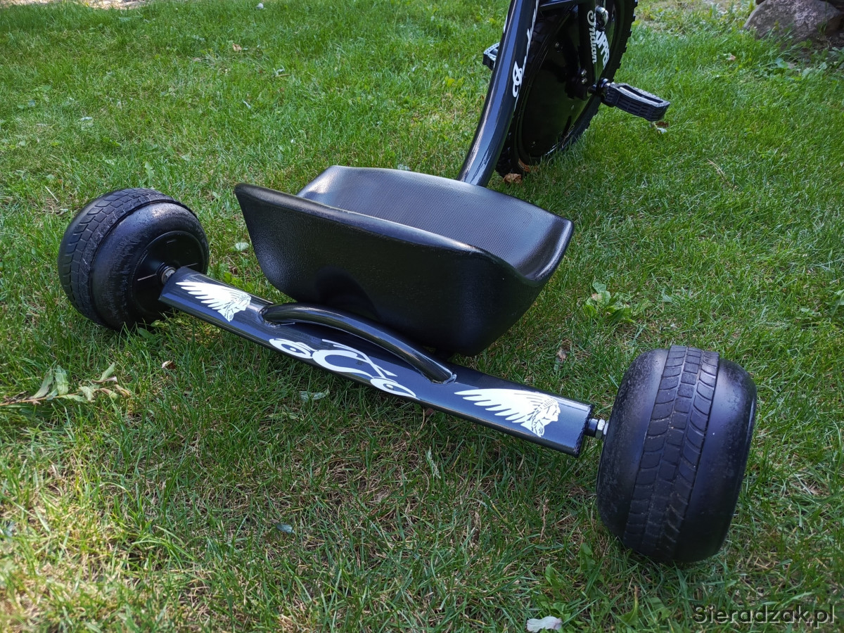 Witam mam do sprzedania Trajkę dla dziecka . Trajka jest używana ale została rozebrana do ostatniej śrubeczki ,wypiaskowana,pomalowana w podkład epoksydowy ,podkład akrylowy ,lakier metalik plus lakier bezbarwny . Zostały zrobione nowe grafiki które są zabezpieczone lakierem bezbarwnym. Założona nowa opona przednia 16 cali. ( w gratisie dokładam drugą opone plus drugą dętkę ) także nowa linka hamulcowa i pancerz hamulcowy.Trajka wygląda bardzo ładnie ,efektownie .Lakier jakim została pomalowana rama to ciemny grafit w metaliku , reszta elementów polakierowana czarnym lakierem akrylowym w połysku.Fotel jest regulowany w kilku wriantach zależności od wzrostu dziecka. Przedni widelec jest imitacją amortyzatora jest to sztywny widelec. Polecam